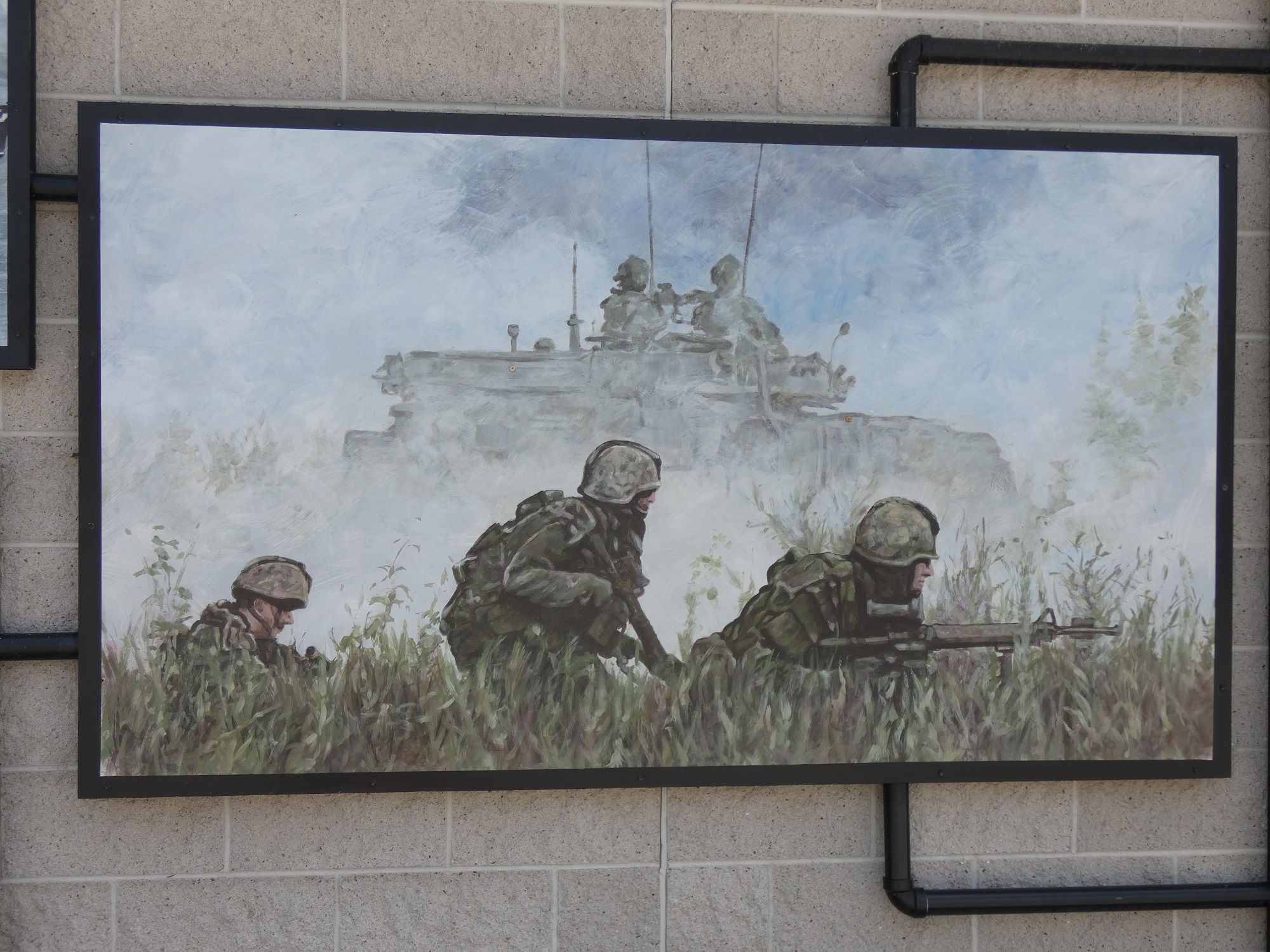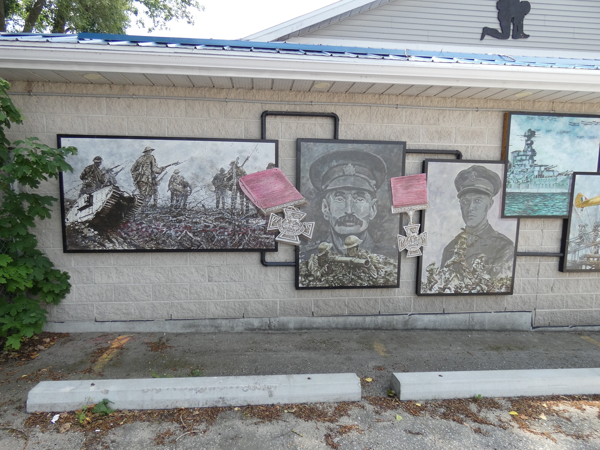 In 2016, Cliff Smith was commissioned by the Royal Canadian Legion Captain Fred Campbell VC Branch 134 to create a mural. The mural depicts the history of Canada's participation in various battles and wars from the First World War to the conflict in Afghanistan and has local history intertwined. It is broken into sections with piping as black lines so the pieces flow together. He began the mural in January and completed it in May.