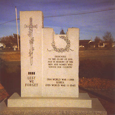 Ce mémorial a été érigé par la filiale no 272 de la Légion royale canadienne et est dédié aux Canadiens et aux Canadiennes qui ont servi durant les Première et Seconde Guerres mondiales et la guerre de Corée. Une couronne de lauriers et une croix du sacrifice sont gravées sur la stèle.