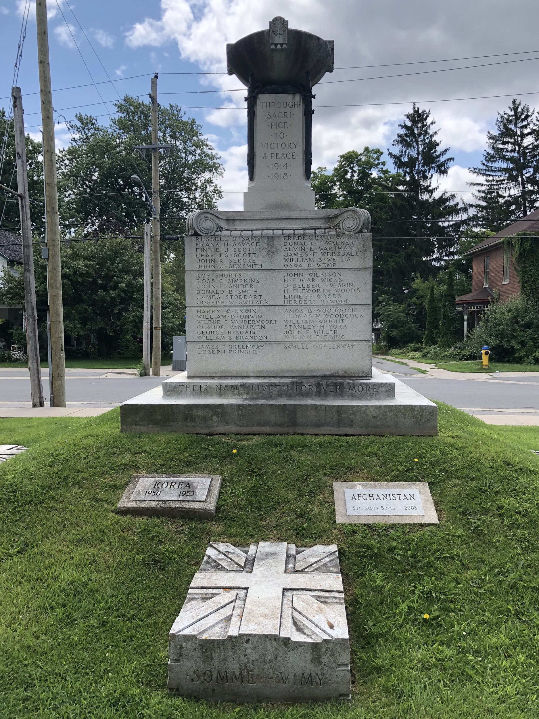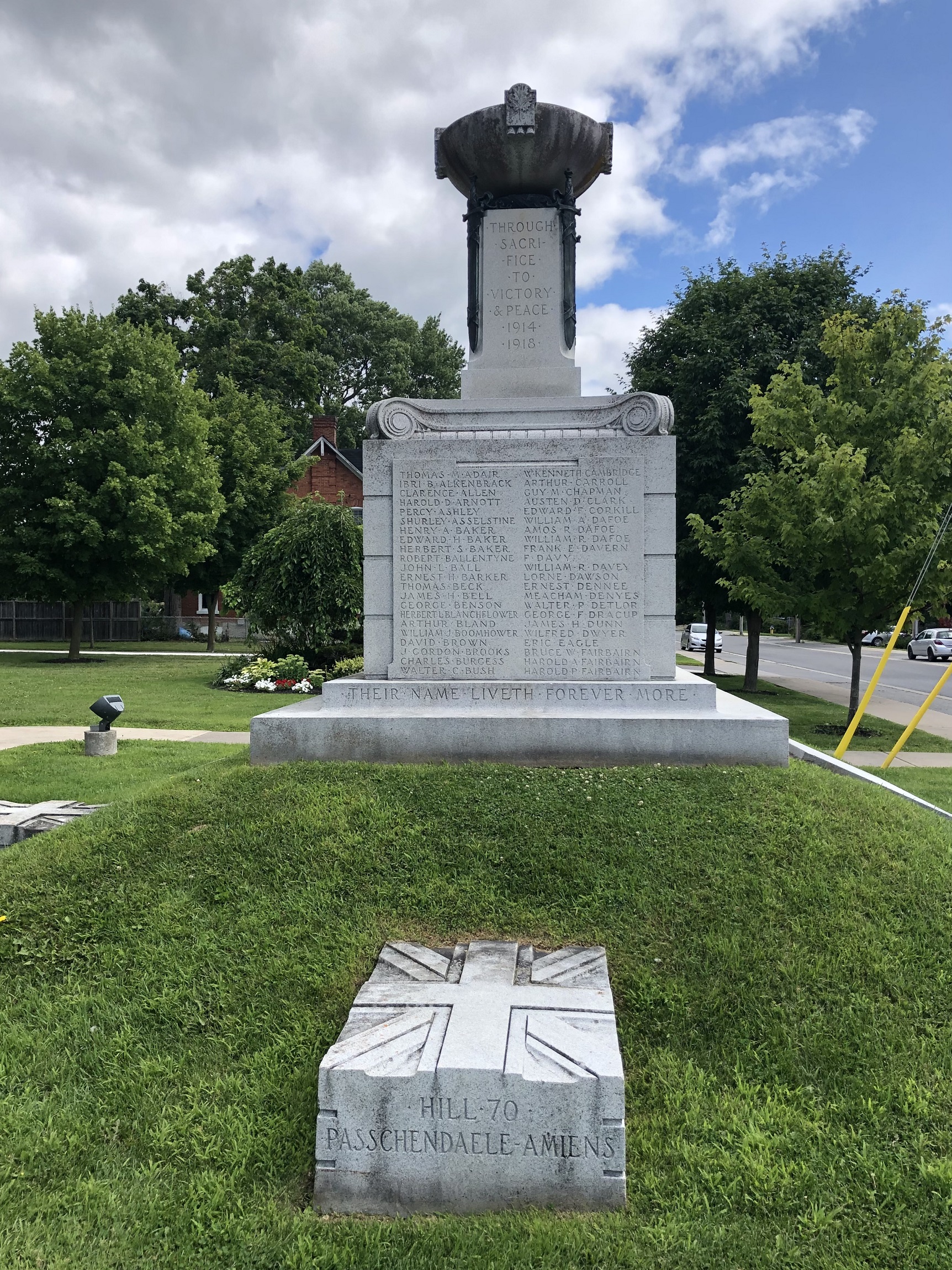 La base du cénotaphe de Napanee est fabriquée à partir de granite de Barre (Vermont), connu comme la roche des temps. Les noms des 156 hommes qui sont tombés au combat pendant la Première Guerre mondiale y sont gravés. L’énorme sacrifice que ces hommes ont consenti pour nous permettre de remporter la victoire et rétablir la paix est illustré par des épées supportant l’autel et des feuilles d’érable. L’hommage à ceux qui ont remporté la victoire est en bronze.