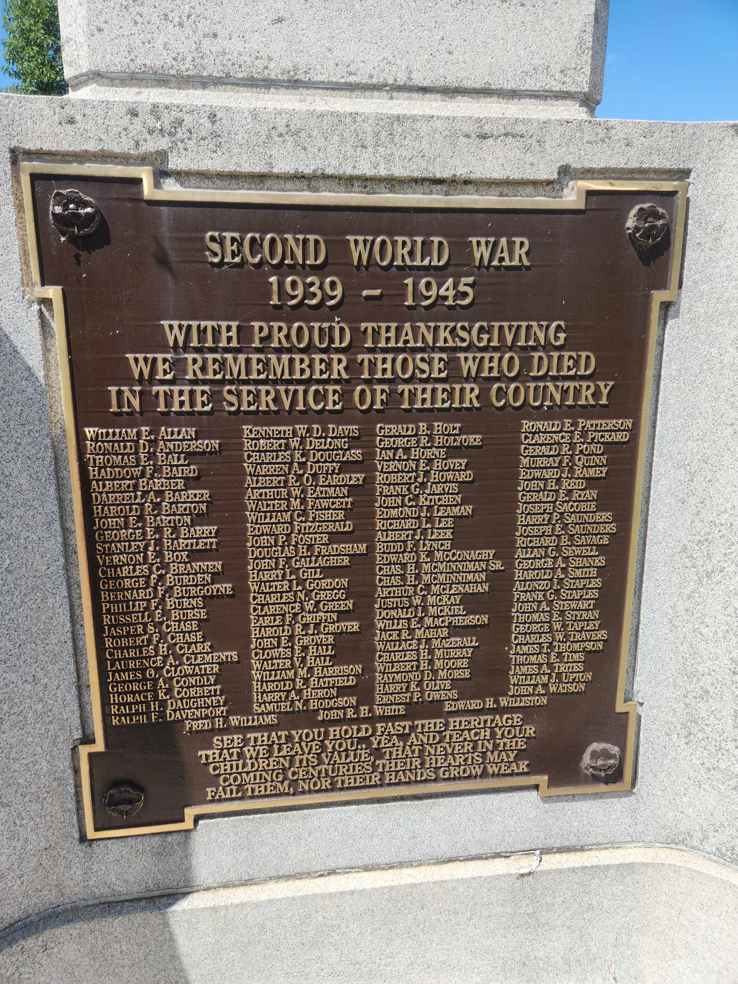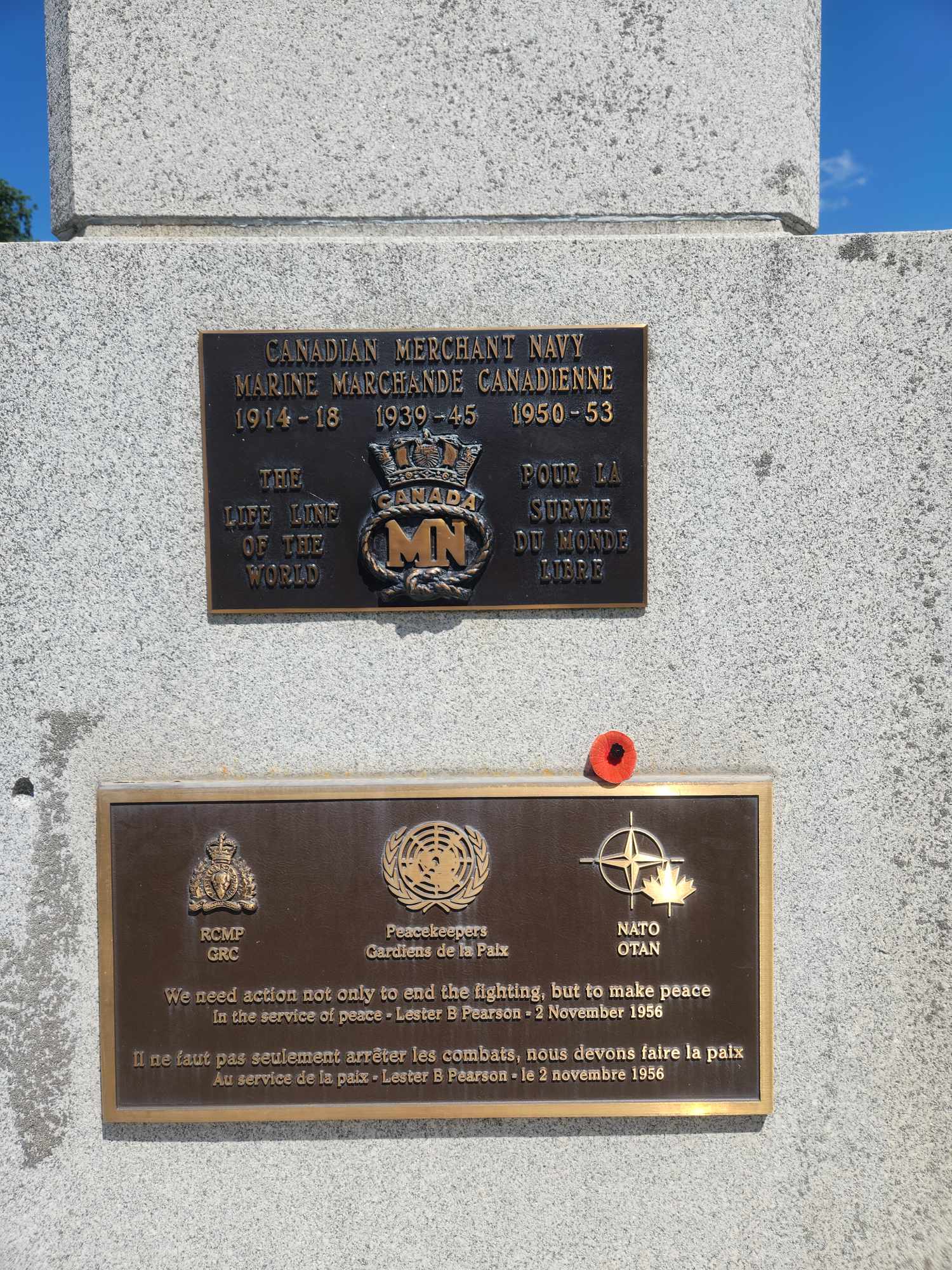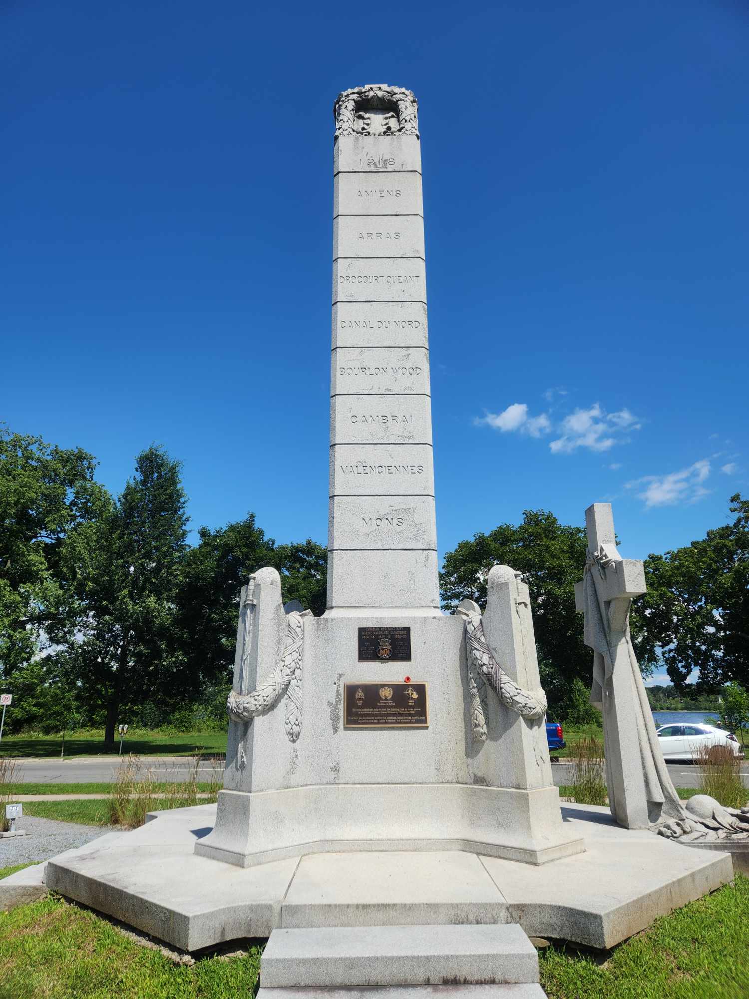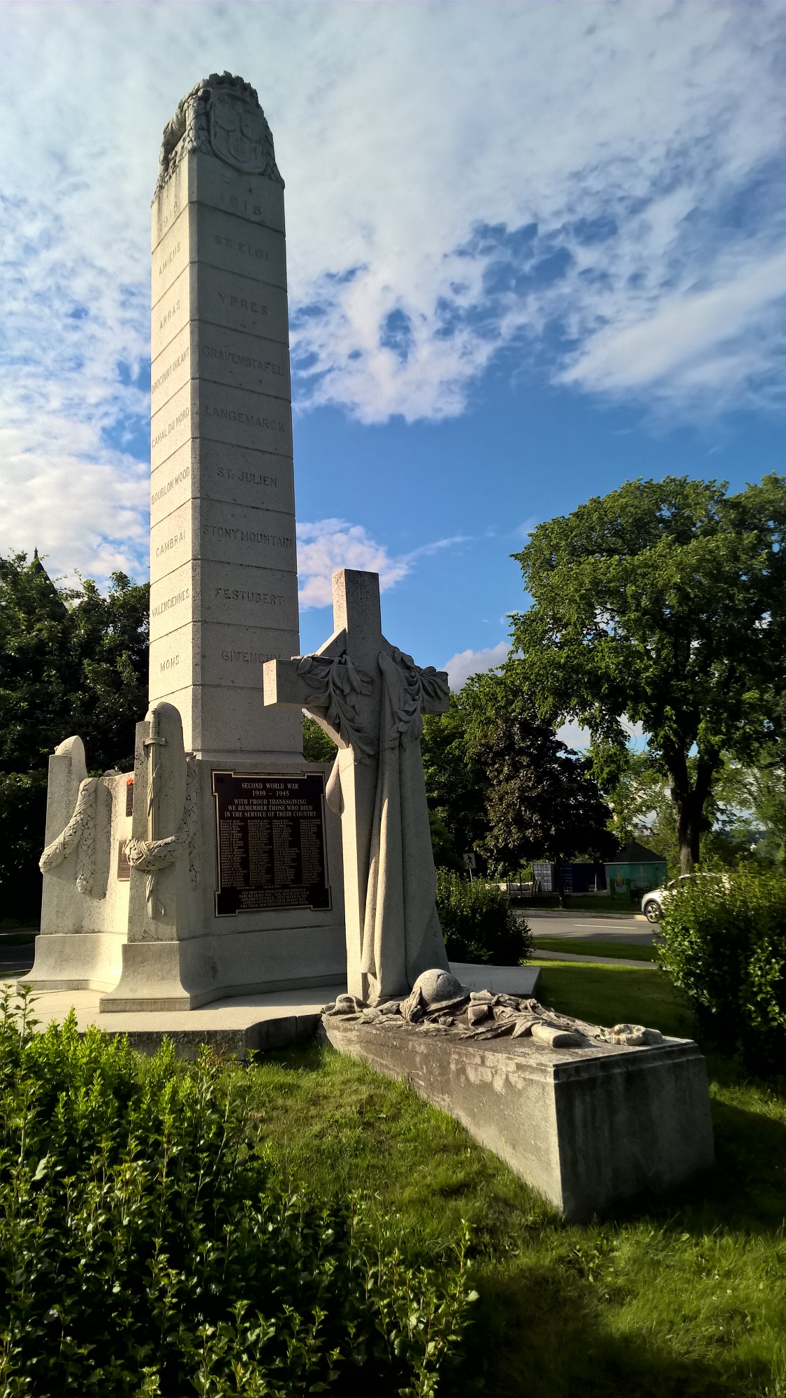 Presque tout de suite après la fin de la Première Guerre mondiale, un groupe de citoyens animés d’un fervent esprit civique a décidé d'ériger un mémorial durable, sous une forme ou sous une autre, afin de rappeler le souvenir des membres de la communauté ayant sacrifié leur vie pour la patrie au cours du conflit. Un comité baptisé le « Fredericton War Memorial Committee » a été constitué sous la présidence de M. le Juge O. Crocket de la Cour suprême du Canada, ancien député fédéral de York-Sunbury, afin d’étudier la question et de mettre l’idée en œuvre. Un haut socle de pierre posé sur une base convenable et installé sur un terrain agréablement aménagé a été jugé approprié et le triangle formé par l’intersection des rues Church, King et Queen a été choisi. Ce terrain, propriété de l’évêché, a été cédé au comité par le très révérend John H. Richardson, évêque de Fredericton, au nom de l’évêché, pour servir à l’érection du mémorial. Les plans soumis par une firme québécoise ont été choisis et les fonds nécessaires ont été amassés par souscription publique. Le terrain a été arpenté par M. Andrew MacVey, ingénieur en chef du ministère provincial des Travaux publics, auquel le comité avait demandé avis et conseils sur l’emplacement et l’érection du mémorial. Comme les plans et devis ne permettaient pas au comité de se faire une idée réaliste du mémorial, M. MacVey a fabriqué une maquette en carton afin d’aider les membres du comité, qui ne s’entendaient pas sur la direction vers laquelle le mémorial devait faire face (vers l’amont, vers l’aval, vers la cathédrale ou ailleurs), à se représenter l’apparence du mémorial dans chaque direction. M. MacVey a également prévu la disposition du texte. L’érection du cénotaphe en pierre du Québec a ensuite pu aller de l’avant, au coût d’environ 20 000 $, soit une somme considérable pour l’époque. Le monument a été inauguré le 11 novembre 1923 à l’occasion d’une cérémonie au cours de laquelle les habitants de Fredericton ont rendu un hommage bien mérité à leurs concitoyens qui avaient fait l’ultime sacrifice. Les noms des 109 « hommes de Fredericton qui ont donné leur vie pendant la Grande Guerre et dont les noms ont été inscrits ici par leurs concitoyens reconnaissants » ont été lus à haute voix pendant la cérémonie. Par la suite, le cénotaphe a été éclairé et des plaques de bronze y ont été ajoutées pour honorer la mémoire des combattants morts pendant la Seconde Guerre mondiale et la guerre de Corée. Ce magnifique mémorial fait honneur aux citoyens des jours passés qui se sont fait un devoir solennel de perpétuer la mémoire, les gestes et les sacrifices des défunts. Avec sa dignité classique et son environnement agréable, le site est empreint d’une émotion poignante, qui est perceptible en tout temps, mais qui nous étreint presque physiquement, telle une baïonnette acérée, pendant les cérémonies du jour du Souvenir, lorsque les notes obsédantes de la sonnerie aux morts, l’ultime appel de la trompette et les coups de canon se réverbèrent sur l’autre rive de la rivière et vont mourir au loin parmi les ormes, dans un silence qui semble soudain plus profond que jamais.« Au crépuscule comme à l’aube, nous nous souviendrons d’eux. » Pendant un instant, on ressent une résolution commune, un tressaillement de la chair, une ineffable solitude au moment où ces paroles évocatrices rappellent une foule de souvenirs à l’assemblée recueillie. Les premières années après la Première Guerre mondiale, les cérémonies du jour de l’Armistice (rebaptisé plus tard « jour du Souvenir ») à Fredericton étaient organisées par le chapitre sir Howard Douglas de l’Ordre impérial des filles de l’Empire (IODE). Cependant, depuis 1928, c’est la filiale de Fredericton de la Légion royale canadienne qui a toujours pris les arrangements nécessaires. Les porte-étendards des divers chapitres de l’IODE ont toutefois continué d’assister en groupe à ces cérémonies. Le comité chargé de l’érection du mémorial militaire de Fredericton se composait des membres suivants : l’honorable juge Crocket, président; la comtesse d’Ashburnham; le lcol T.G. Loggie; Mgr l’évêque Richardson; Son Honneur le maire J.A. Reid; le lcol C.J. Mersereau; M. George H. Clarke, conseiller municipal; l’honorable juge Barry; M. R. FitzRandolph; M. R.B. Hanson, c.r., député; M. G.N.C. Hawkins; M. C.C. Jones, L.L.D., chancelier de l’Université du Nouveau-Brunswick; Mme N. Dougherty; M. C.A. MacVey; M. J. Stewart Neill; M. J.A. Cain, conseiller municipal; M. F.L. Cooper, conseiller municipal; M. Harry A. Smith, conseiller municipal; M. J.J.F. Winslow, c.r.; M. W.D. Gunter; M. John T. Jennings; E. Allison MacKay, secrétaire. Une plaque à la mémoire des membres de la Marine marchande a été ajoutée récemment. {A History of the Fredericton Legion}