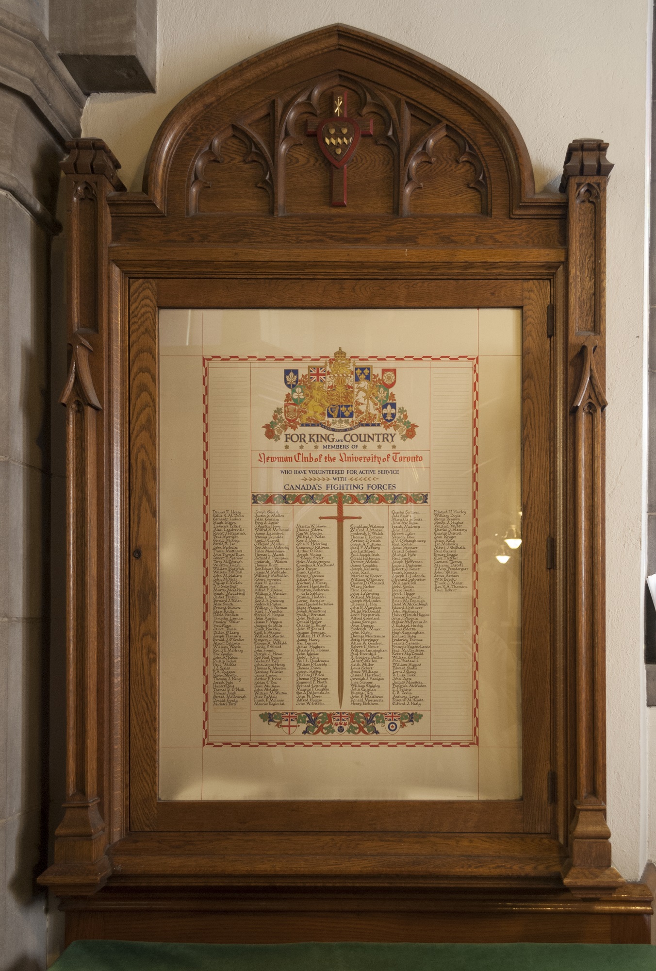 Le tableau de service de la Seconde Guerre mondiale du Newman Club de l’Université de Toronto est exposé dans l’église catholique St. John Henry Newman (anciennement l’église St. Thomas d’Aquin) ou dans la chapelle Newman. Des centres Newman ont été créés dans de nombreux pays afin d’offrir des services de pastorale aux étudiants catholiques qui fréquentaient des universités laïques.