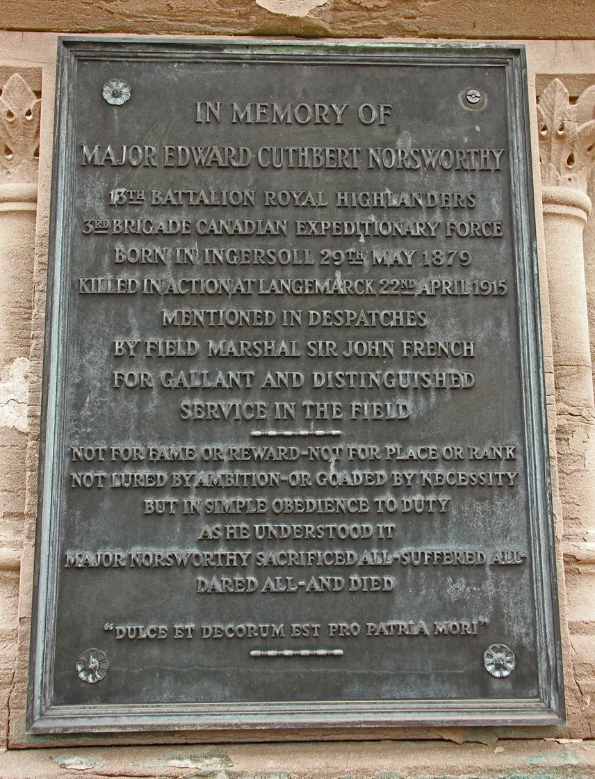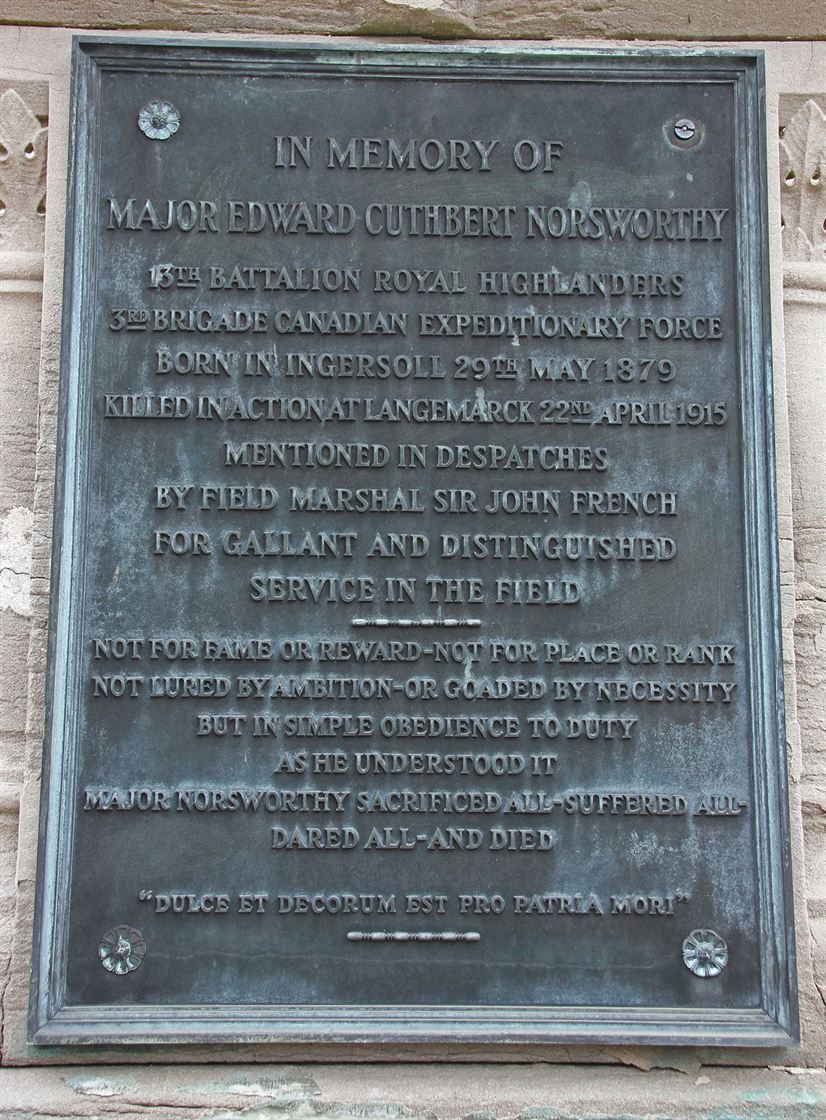 Le monument Norsworthy fut initialement dévoilé pour commémorer l’héroïsme du major Edward C. Norsworthy, mais les quatre fils de James C. Norsworthy servirent aussi durant la Première Guerre mondiale. Le 16 juin 1919, des tablettes ont été ajoutées au monument, à la mémoire de son fils, le lieutenant Alfred James Norsworthy, et de ses neveux, Harold et Robert Hunter, au nom de la Société historique de l’Ontario. Robert fut tué le 17 septembre 1918, et Harold, lui, fut tué seulement six jours avant l’armistice. Ils étaient les fils de la sœur de James C. Norsworthy qui vivait à Brampton, en Ontario.