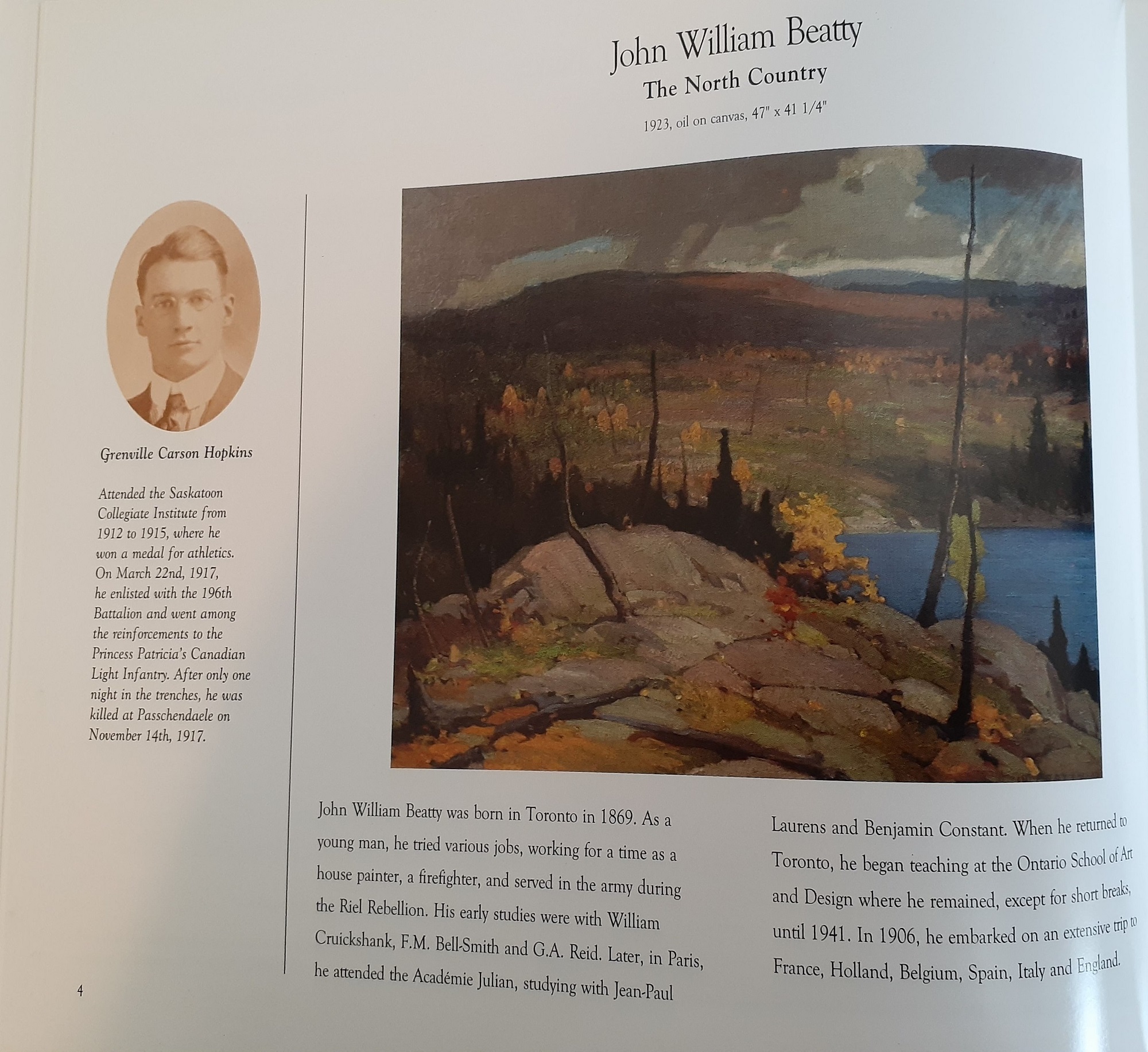 The North Country de John William Beatty a été acquis en 1925 - 1927 et dédié au soldat Grenville Carson Hopkins. Grenville a fréquenté le Saskatoon Collegiate Institute de 1911 à 1915. Il s’est enrôlé le 22 mars 1917, et après une seule nuit dans les tranchées, a été tué à Passchendaele le 14 novembre 1917.