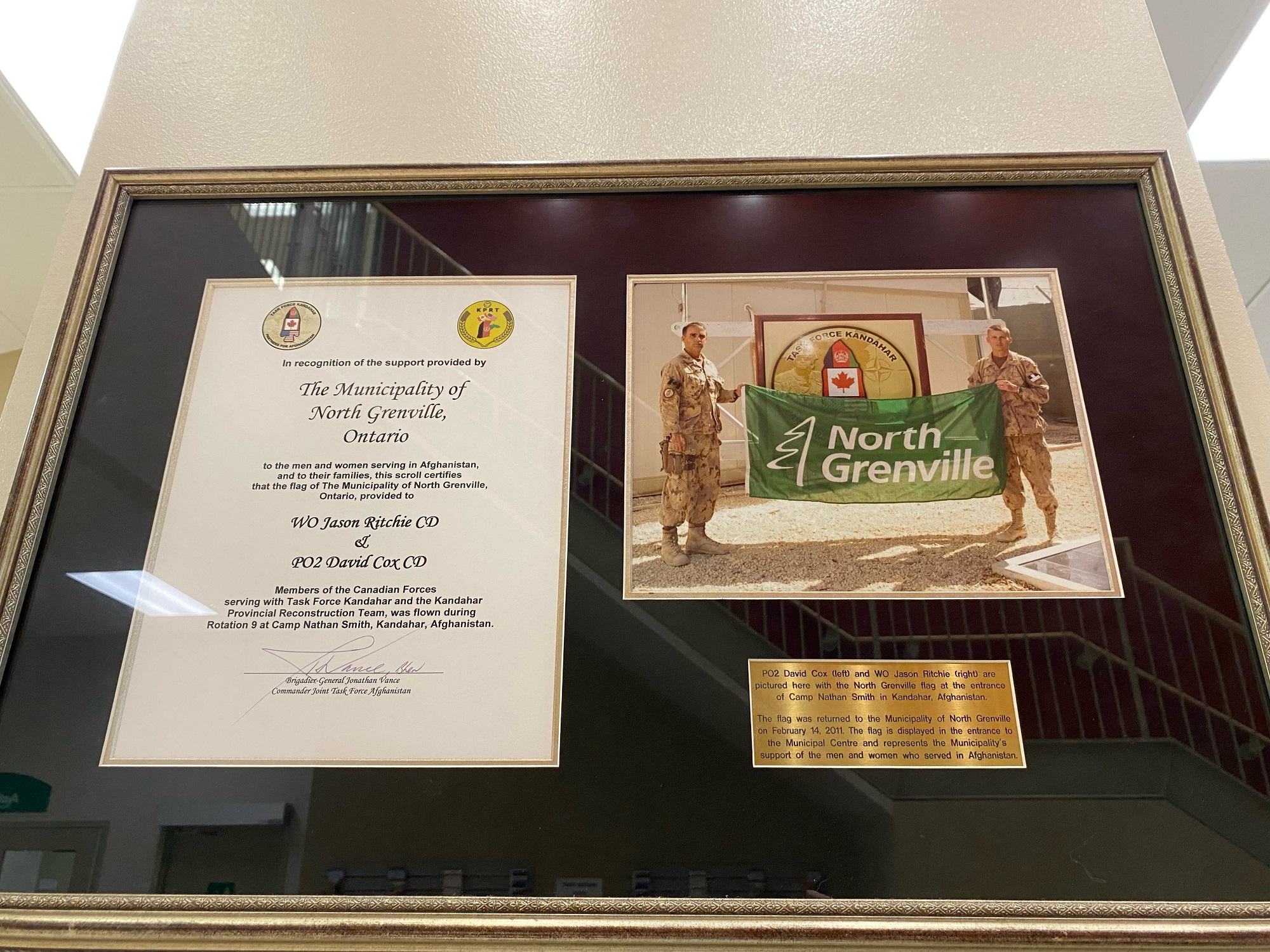 The flag was returned to the Municipality of North Grenville on February 14, 2011. The flag is displayed in the entrance to the Municipal Centre and represents the Municipality's support of the men and women who served in Afghanistan.