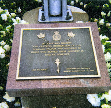 Ce mât portant un drapeau canadien se trouve sur le lot des anciens combattants, au centre des jardins du patrimoine. Une plaque encastrée dans le marbre et portant une inscription se trouve à sa base.