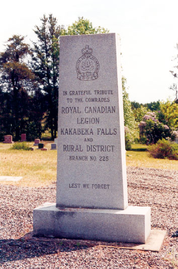 Ce mémorial est dédié aux camarades disparus de la filiale no 225 de la Légion royale canadienne. Il a été érigé par la filiale no 225 (Kakabeka Falls and Rural District).