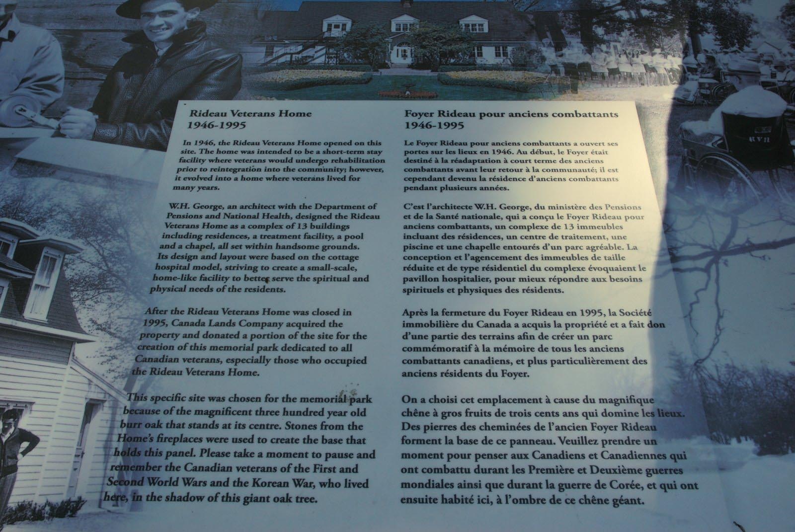 Ce monument commémoratif, qui se dresse sur l’ancien emplacement du Foyer Rideau pour anciens combattants, est dédié tous les anciens combattants canadiens. Il consiste en deux piliers de pierre réunis par une plaque bilingue présentant l’historique du site. Les piliers sont fabriqués de pierres taillées provenant des foyers du Foyer Rideau pour anciens combattants. Deux autres piliers se trouvent sur les côtés, séparés par des bancs qui invitent à une contemplation tranquille.