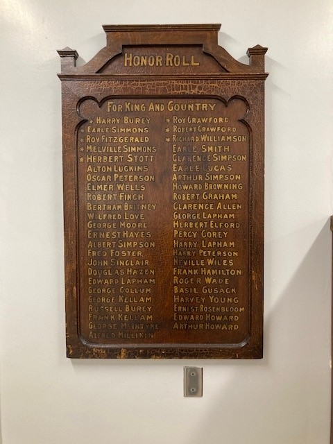 Les rouleaux d’honneur proviendraient de l’église Parker Street Methodist de Sarnia et sont maintenant conservés par les First Hussars de Sarnia et exposés dans le manège militaire George Sitrett.