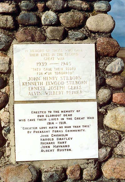 Ce tumulus est dédié aux citoyens de l'endroit qui sont morts pendant la Première et la Seconde Guerres mondiales. On y trouve également une plaque sur l'histoire de la région de Pheasant Forks.