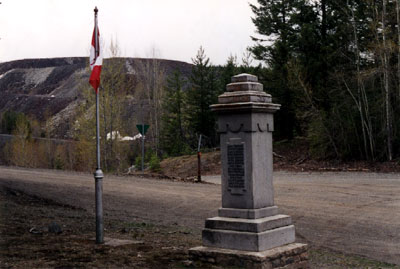 Le cénotaphe de 8 ½ pieds de haut a été érigé en octobre 1920 par Patterson, Chandler et Stephen Ltd. de Vancouver. Il pesait 4 ½ tonnes et était installé sur un affleurement rocheux adjacent à l’ancien dépôt Phoenix CPR, qui était presque le point le plus élevé de la ville – à une altitude de 4 700 pieds, sur la ligne de partage des eaux entre Twin Creek et Fourth of July Creek. Il se trouvait le long de la route principale entre Grand Forks et Greenwood. En 1956, lorsque la société Granby a repris l’exploitation minière, le cénotaphe a été déplacé à son emplacement actuel.