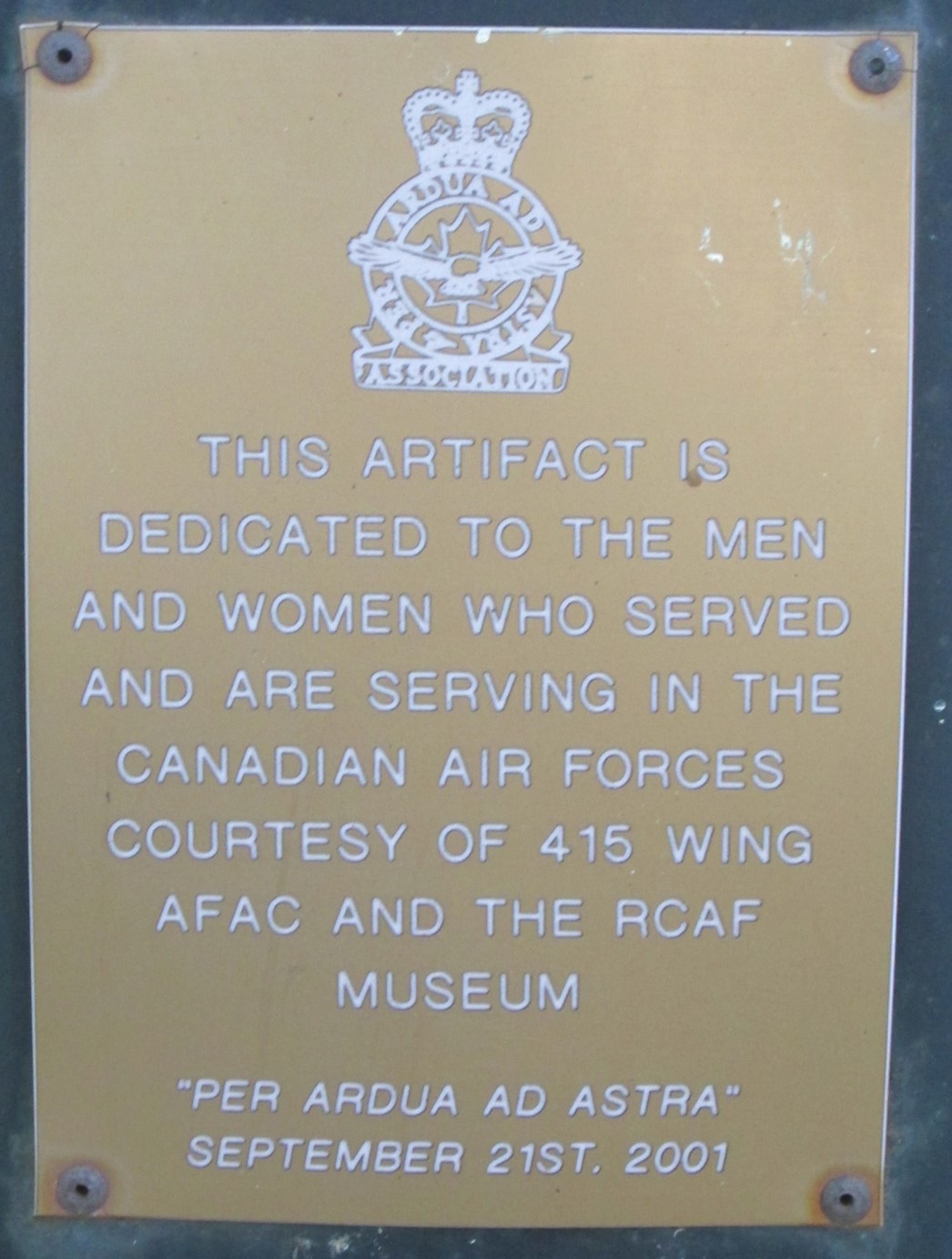 Ce monument a été érigé à la mémoire des hommes et des femmes qui ont servi, ou qui servent encore, dans la Force aérienne du Canada. Il est composé d’une hélice d’aéronef, montée sur un support, et d’une plaque commémorative. Il a été inauguré le 21 septembre 2001 par la filiale 78 de la Légion royale canadienne.