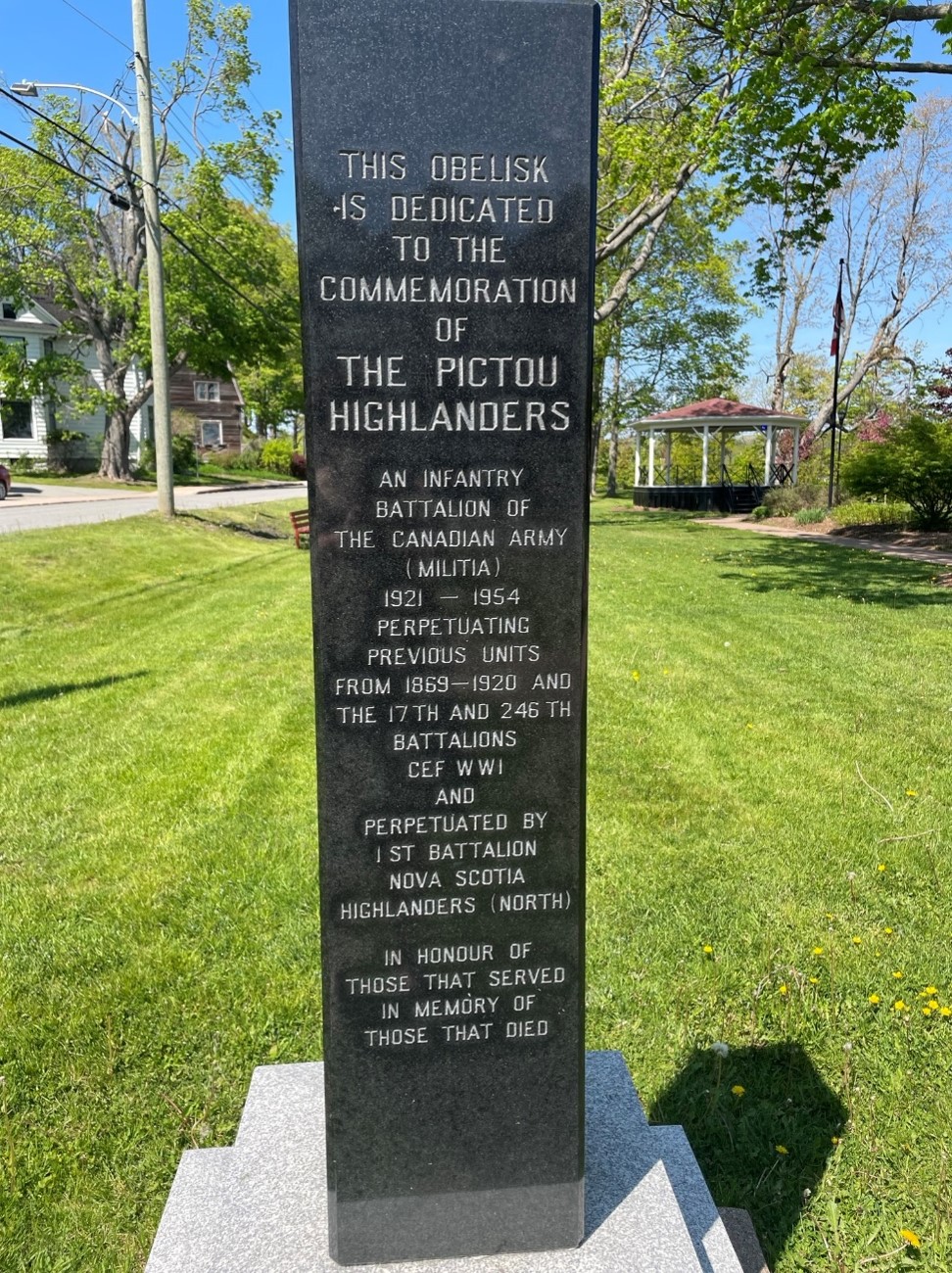 Érigé par le Pictou Highlanders Memory Club, ce mémorial est dédié aux vétérans et à ceux qui sont morts parmi les Highlanders, un bataillon d’infanterie des Forces canadiennes (Milice) et ses anciennes unités. Le bataillon a été renommé Pictou Highlanders le 2 juillet 1920. Le 12 novembre 1954, il a été fusionné avec les North Nova Scotia Highlanders et la 189e Batterie d’artillerie antiaérienne légère de l’Artillerie royale canadienne et a été renommé le 1er Bataillon des Nova Scotia Highlanders.