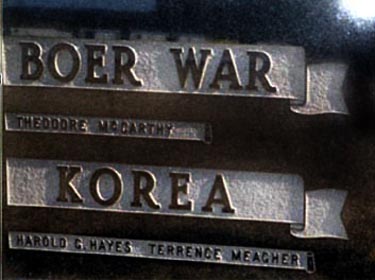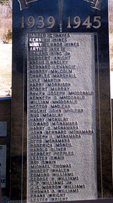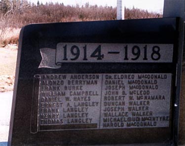 Notes : Au cours de conversations avec Harold Oliver, ancien combattant de la Seconde Guerre mondiale, celui-ci a mentionné quelques erreurs sur le mémorial. Michael (Bud) MacIntyre et Harold MacDonald sont inscrits parmi les combattants de la Première Guerre mondiale, alors qu’en réalité, ils ont participé à la Seconde Guerre mondiale. Cette erreur s’explique par le fait que le comité du mémorial a eu du mal à entrer en contact avec eux pour savoir s’ils souhaitaient voir leur nom inscrit sur le mémorial. Le temps que le comité réussisse à les joindre, le monument était déjà érigé et il ne restait plus de place pour leurs noms parmi les anciens combattants de la Seconde Guerre mondiale; c’est pourquoi ces noms ont été ajoutés à la liste des anciens combattants de la Première Guerre mondiale.