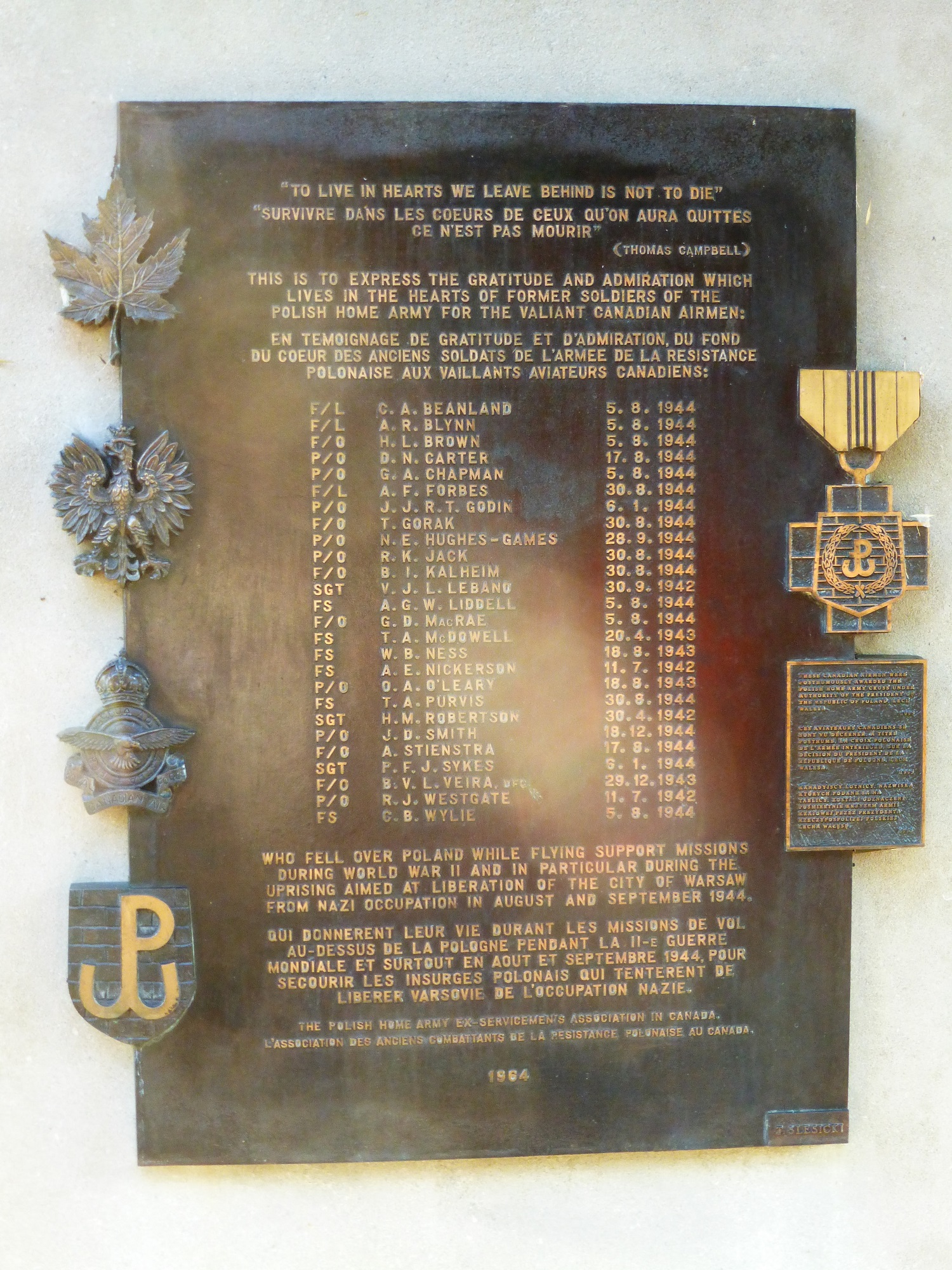 La grande plaque porte quatre symboles sur le bord gauche : une feuille d’érable, un aigle polonais, l’emblème de l’ARC et celui de l’Armée polonaise de l’intérieur. En 1995, lorsque les aviateurs ont reçu à titre posthume une décoration polonaise, les éléments suivants ont été ajoutés sur le bord droit de la plaque : une réplique en bronze de la croix de l’Armée polonaise de l’intérieur et une petite plaque portant une inscription.