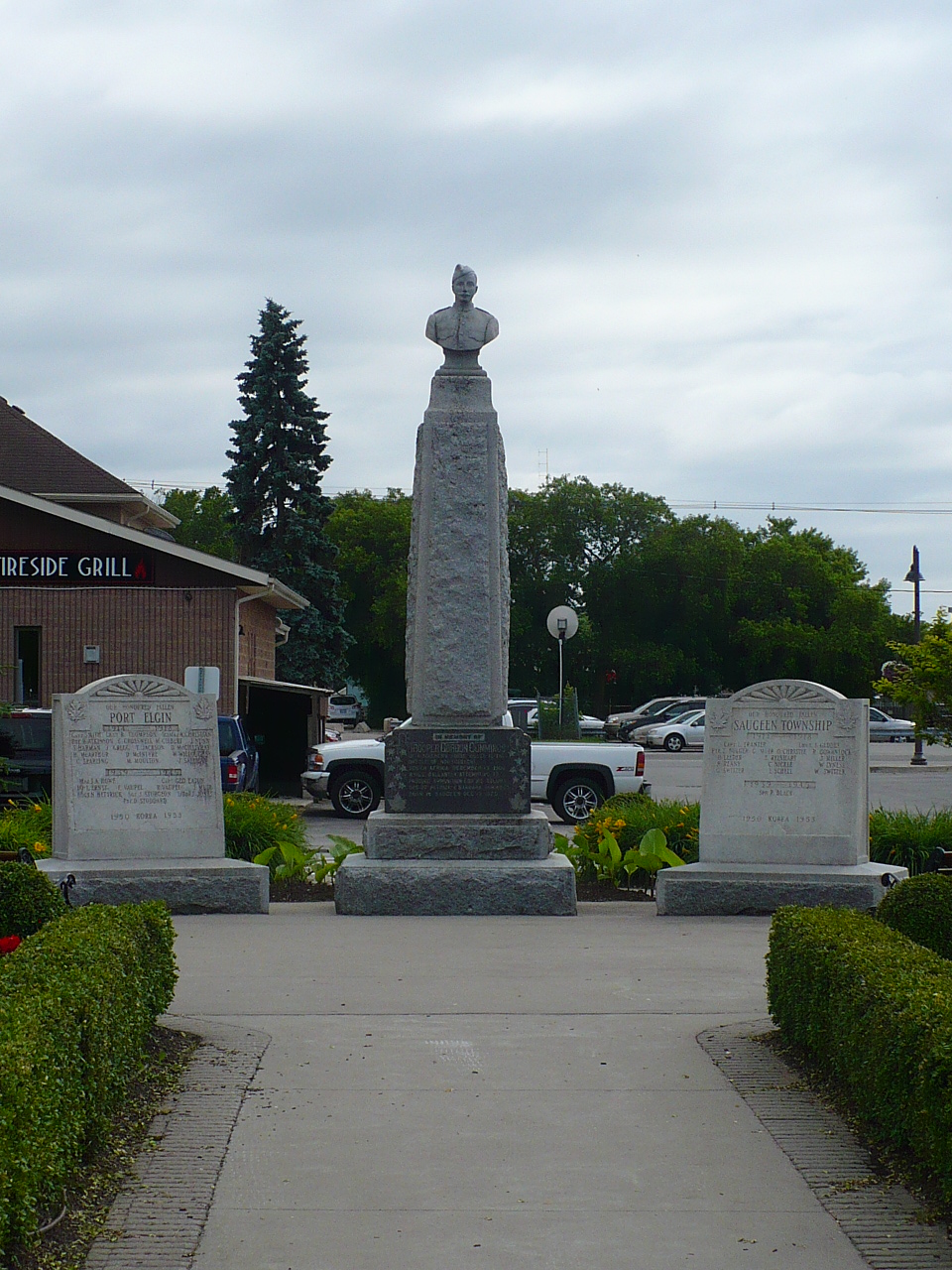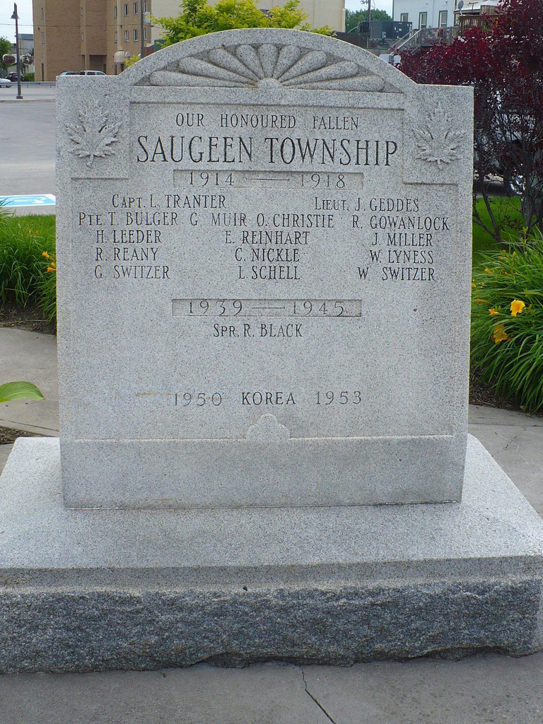 En 1924, les citoyens du canton de Saugeen et de Port Elgin érigèrent sur le site deux monuments commémoratifs correspondants pour rendre hommage à ceux périrent durant la Grande Guerre. En 1962, les pierres furent gravées à nouveau pour y ajouter les noms des personnes qui périrent durant la Seconde Guerre mondiale. D’autres gravures furent ajoutées en 1986 pour commémorer la guerre de Corée.