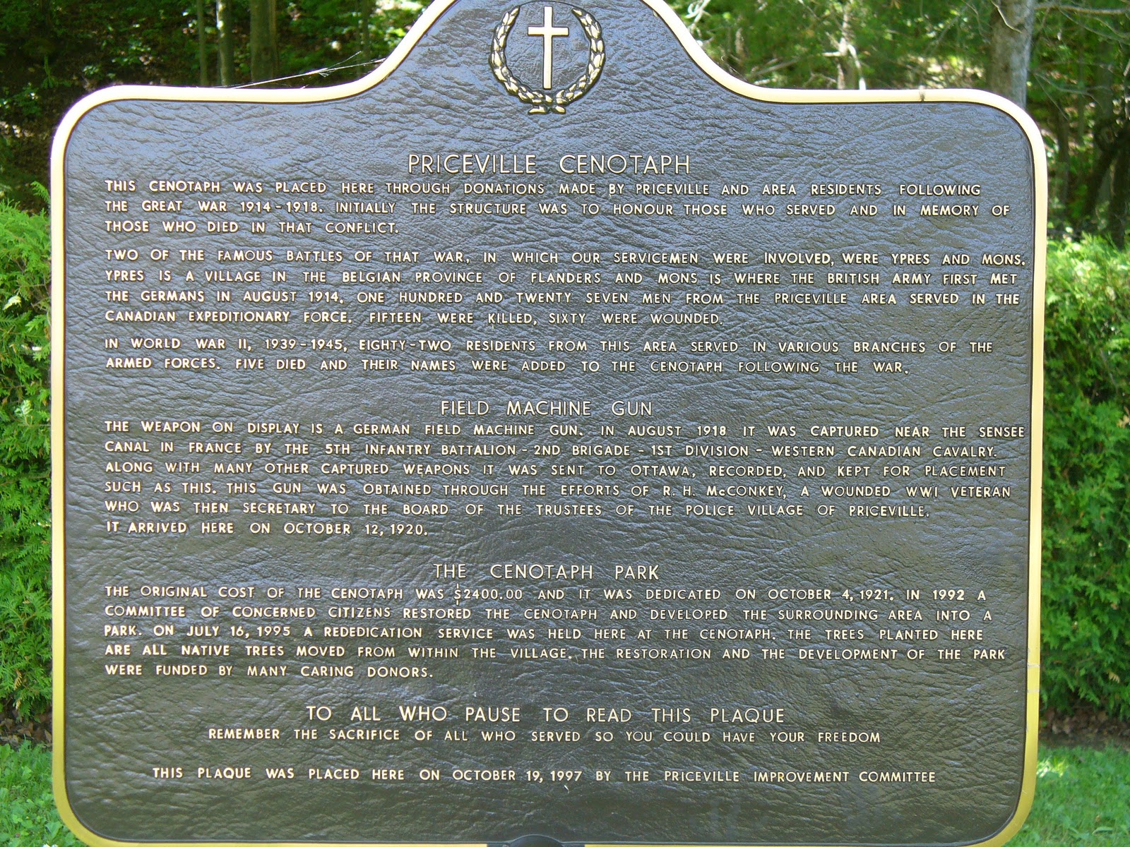 Le cénotaphe de Priceville a été érigé grâce à des dons faits par les résidents de Priceville et des environs. La statue de marbre représentant un soldat repose sur un socle de granit.
