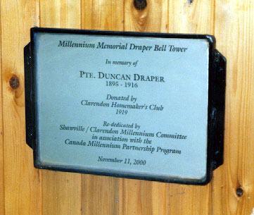 Ce mémorial est dédié au soldat Duncan Draper. Il a été donné par le Clarendon Homemaker's Club en 1919.