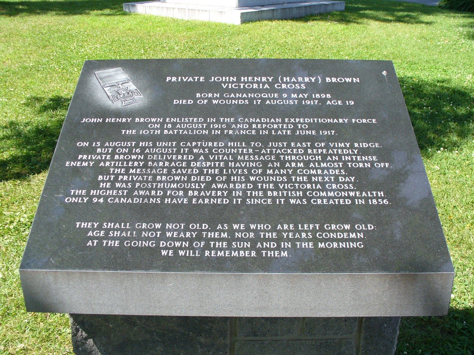 Ce mémorial est dédié à soldat Harry Brown, né à Gananoque, Ontario le 11 mai 1898, pour son acte de bravoure durant la Première Guerre Mondiale.