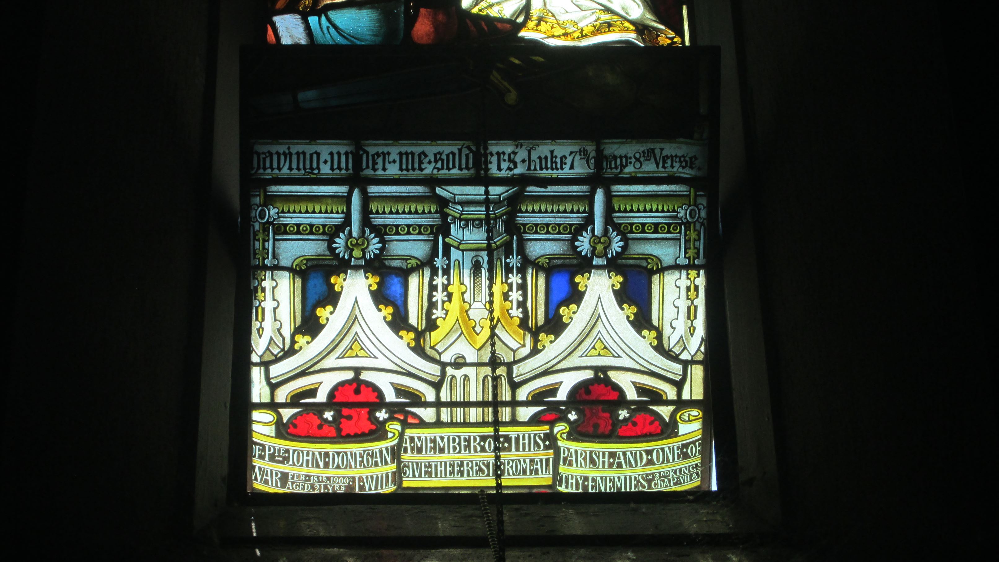 Ce vitrail est dédié à la mémoire du soldat John Andrew Donegan, un des premiers soldats à être tué durant la guerre d’Afrique du Sud.