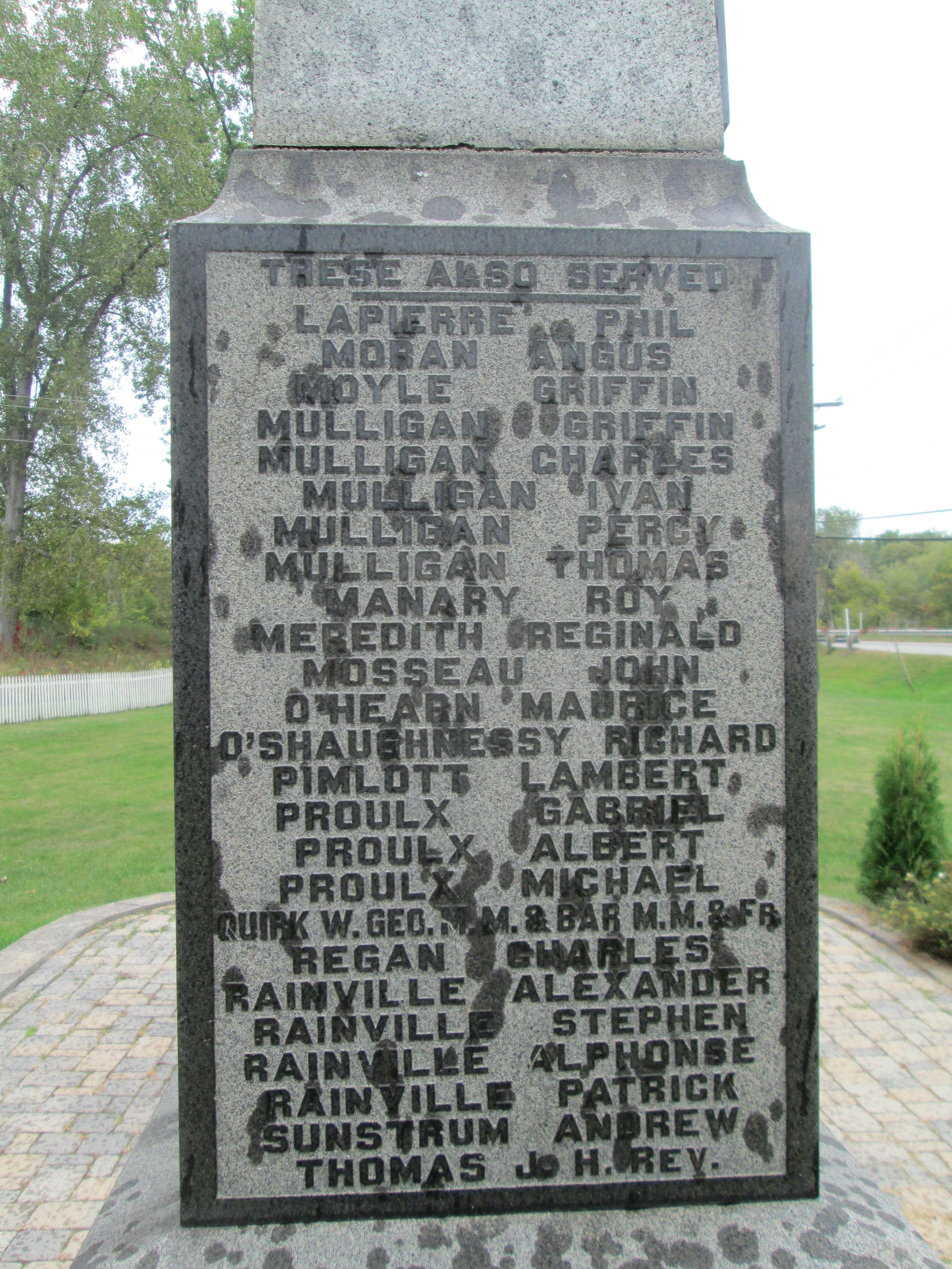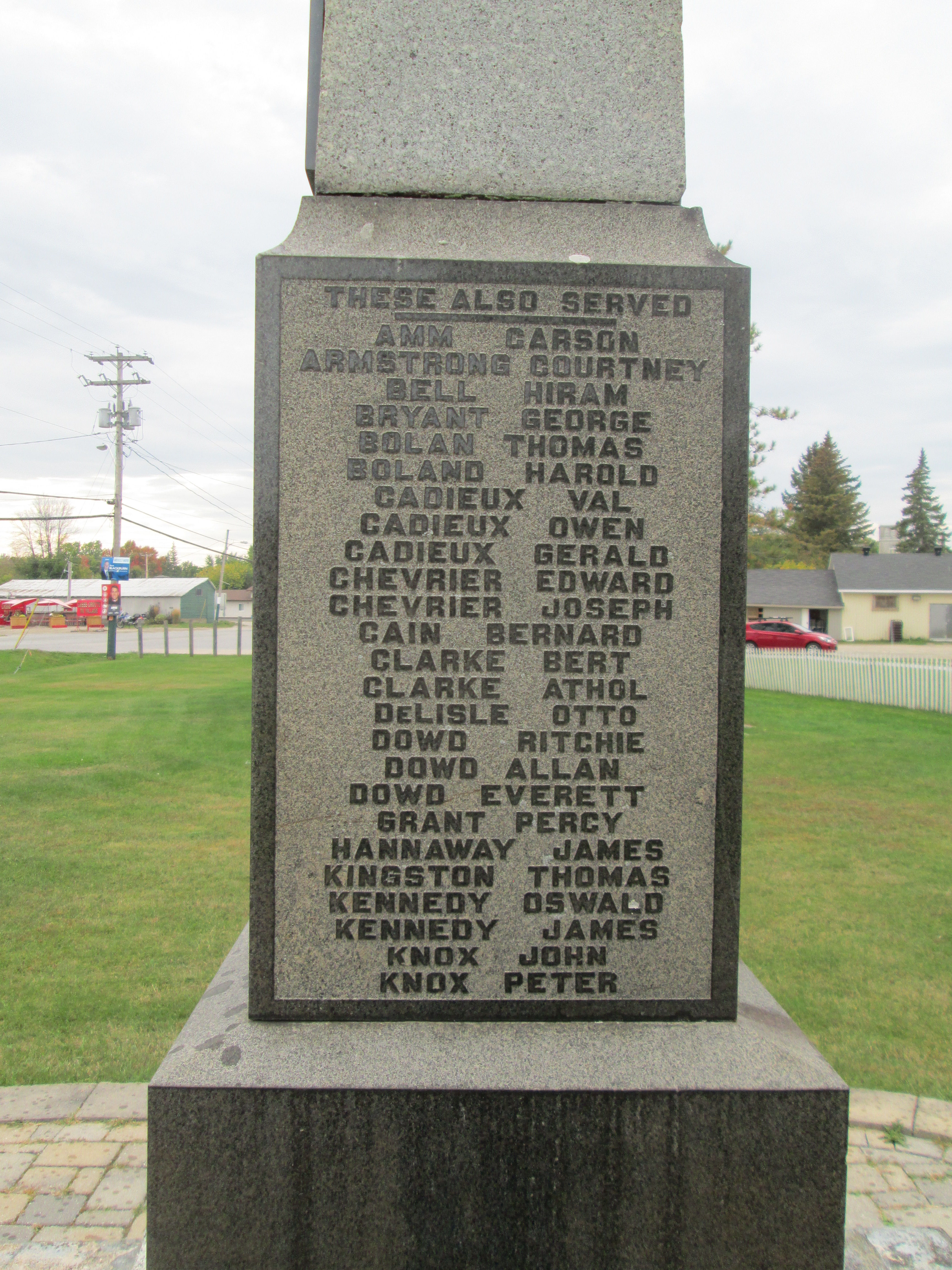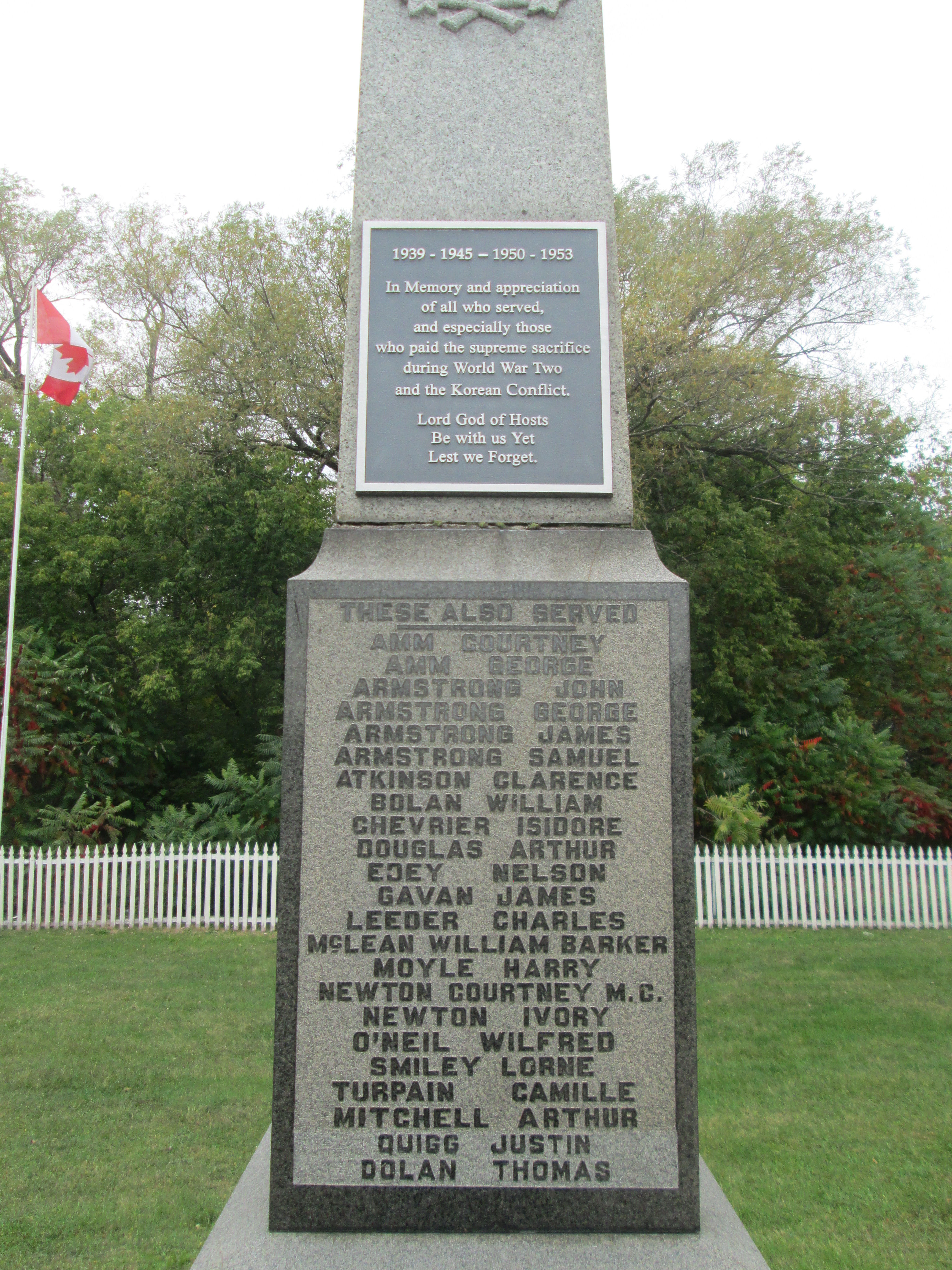 Érigé par la section de Quyon de l’Ordre impérial des filles de l’Empire en hommage aux citoyens de Quyon tués au cours de la Première Guerre mondiale, ce monument a été par la suite agrandi pour que l’on puisse y ajouter une plaque commémorant les morts de la Seconde Guerre mondiale et de la guerre de Corée.