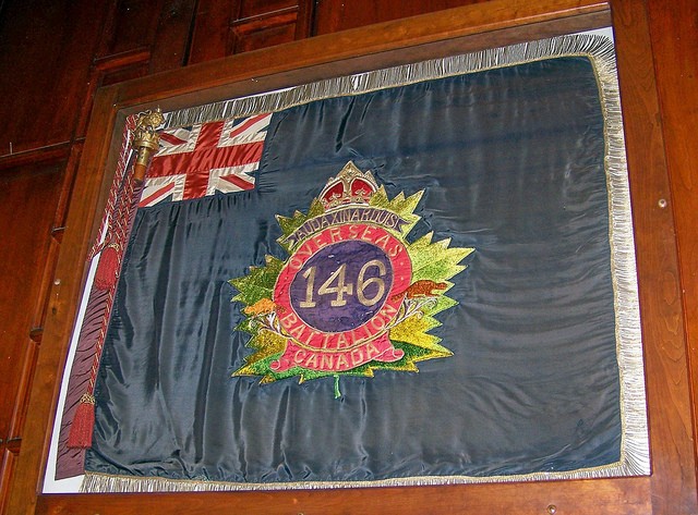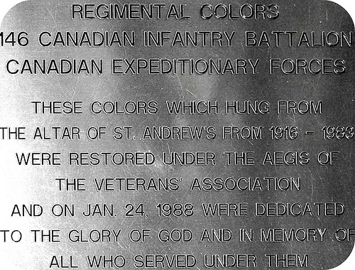 Les drapeaux régimentaires du 146e Bataillon d’infanterie du Canada du Corps expéditionnaire canadien ont suspendus au-dessus de l’autel de l’église de St Andrew depuis 1916.