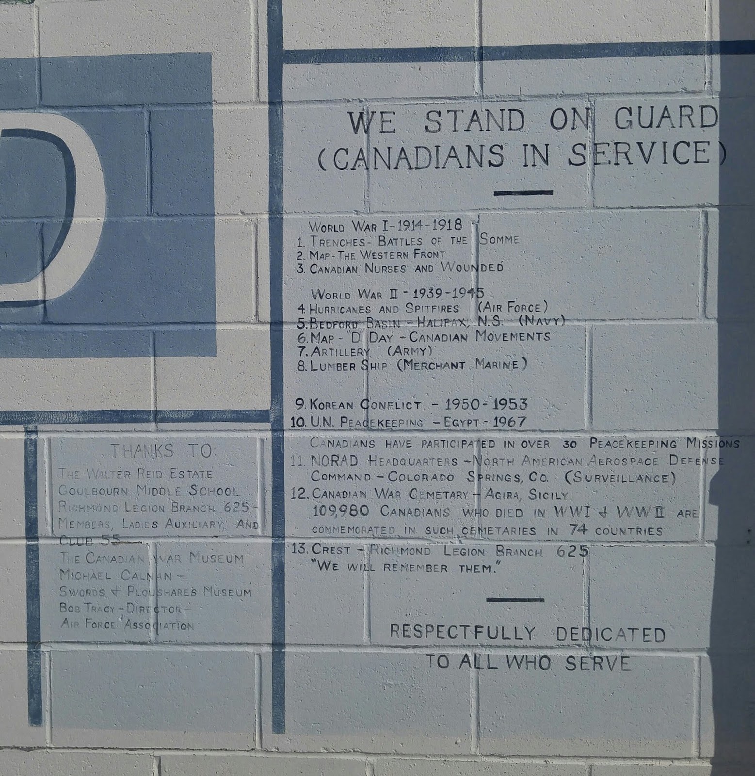 La murale de la Légion de Richmond a été conçue par Becky Marr-Johnson, membre de la Légion. Il lui a fallu des centaines d’heures et plus d’un an pour la réaliser. La murale est divisée en deux sections : la section de gauche dépeint l’histoire de Richmond et du Canada; au centre de la murale se trouve une feuille d’érable canadienne; et la section de droite montre des Canadiens en service, de la Première Guerre mondiale à 1967.