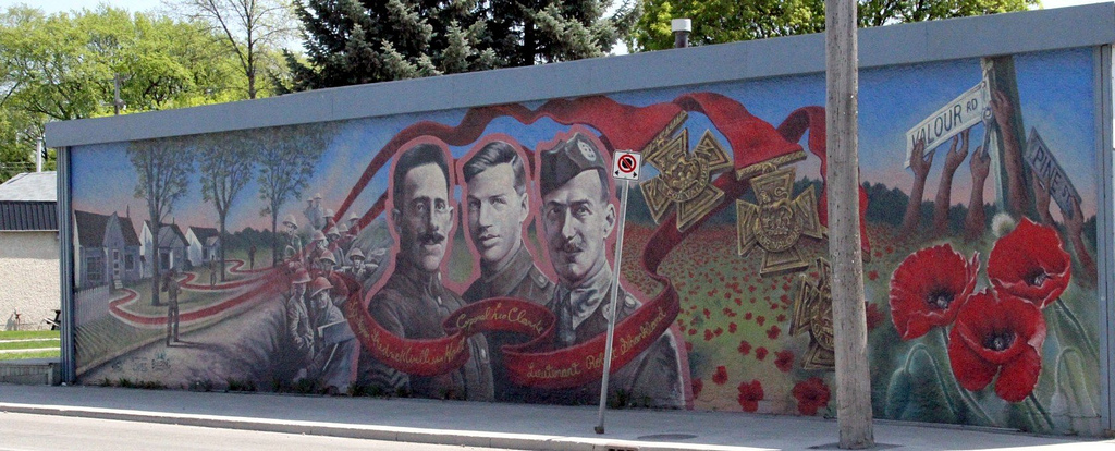 La murale Road to Valour est dédiée à Leo Clarke, Frederick William Hall et Robert Shankland, héros de la guerre ayant vécu dans Pine Street, qui a depuis été renommée Valour Road.