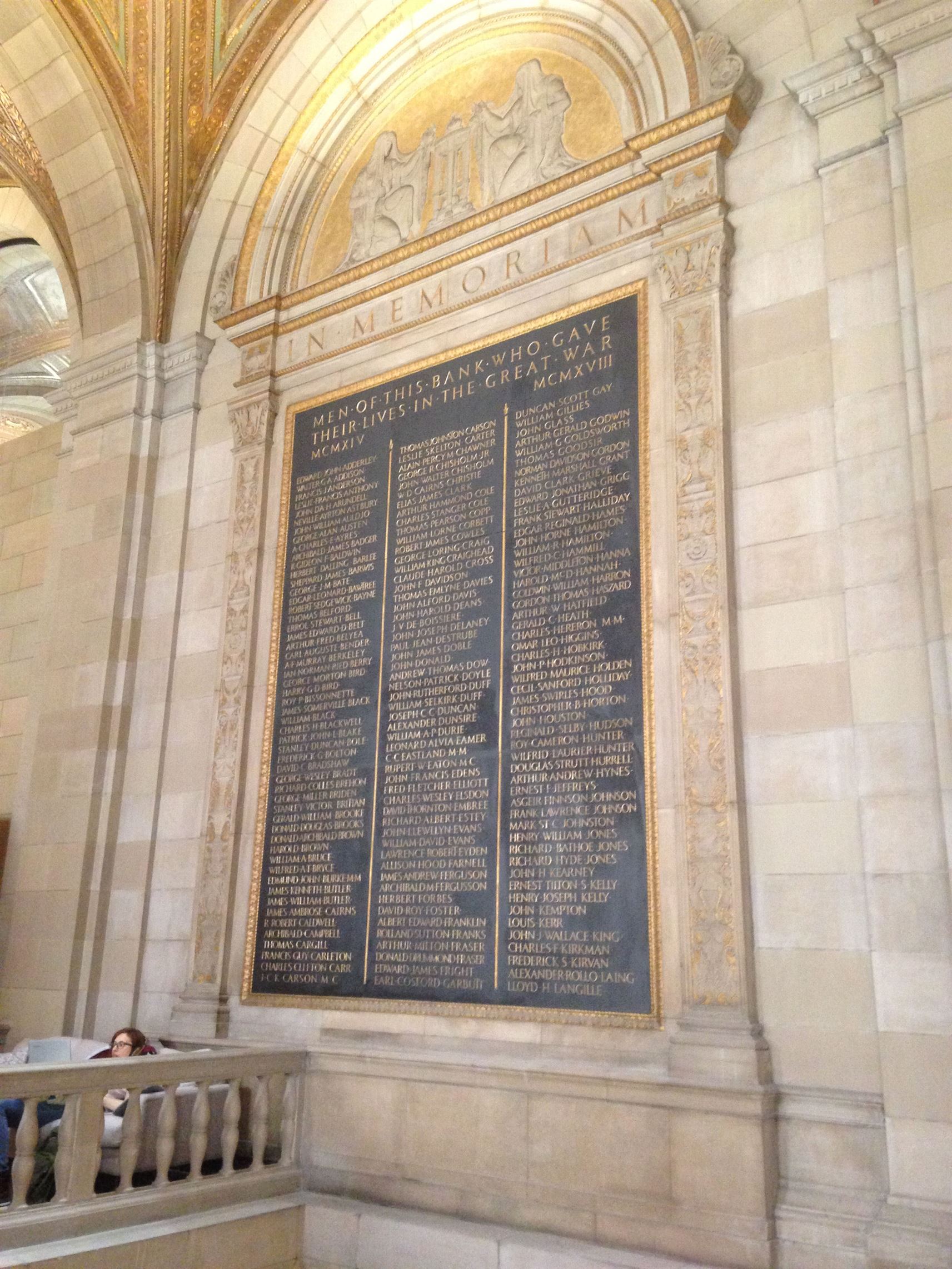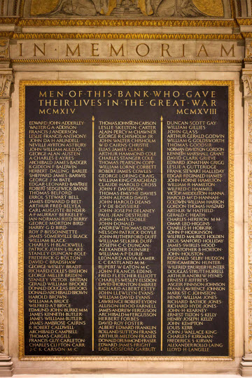 Elles y sont depuis l’ouverture de la succursale en 1928. Chacune est intitulée In Memoriam, suivie des mots « Men of this bank who gave their lives in the Great War » (« Voici les hommes de cette banque qui ont donné leur vie durant la Grande Guerre ») avec les dates du conflit en chiffres romains. Les noms apparaissent en ordre alphabétique, de A à L sur la plaque de gauche et les autres inscrits sur la plaque de droite. Chaque panneau est surmonté d’effigies à genoux sculptées dans du marbre blanc, de la Foi et du Courage, qui entretiennent le feu sacré du souvenir par des offrandes de coquelicots et de laurier.