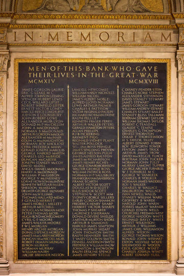 Encadrant l’escalier qui mène à l’entrée de l’ancienne succursale principale de la Banque Royale dans l’Édifice de la Banque Royale au 360, rue Saint-Jacques à Montréal, deux plaques de marbre noir présentent, gravés en or, les noms des 325 employés de la banque qui ont péri durant la Première Guerre mondiale.