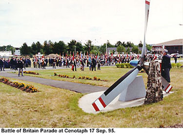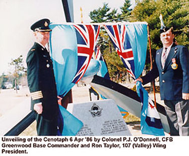 Ce mémorial a été érigé par la 107e Escadre de l’association de l’Aviation royale du Canada (AARC) et dédié le 6 avril 1986, un an et demi après la soumission des plans. En septembre de chaque année, la 107e Escadre célèbre la bataille d’Angleterre par une cérémonie au cénotaphe en mémoire de ceux qui ont perdu la vie au combat durant la Seconde Guerre mondiale. Ils sont accompagnés par des éléments de la 14e Escadre de Greenwood, des filiales locales de la Légion royale canadienne et de l’Escadron 517 des Cadets de l’air de Greenwood. La 107e Escadre de Greenwood (Valley) dévoila son nouveau cénotaphe par une cérémonie de dédicace et une parade. Le comité du cénotaphe était formé de : Gord Faulkner, président; Ron Franklin, vice-président; Jim Metlin et Tom Lupton, design; Jim Hawley et Bert Carpenter, construction et; Cindy Bawn, secrétaire. Un an de négociations avec le MDN pour la location du terrain et l'approbation du design, aboutit finalement de façon positive. Les travaux ont été exécutés par le Comité aidé par d'autres membres de l’Escadre et les coûts ont été couverts par l’entremise de projets spéciaux de l’Escadre et l’hélice donné par Robb Engineering, de Amherst, N.E. Le révérend lcol. (ret.) Hal Cox, aumônier de l’Escadre, célébra la cérémonie. Il était assisté du révérend capt. Joseph MacLean (RC) BFC Greenwood. Les cornemuseurs bénévoles de la BFC Greenwood les accompagnaient. Les couronnes ont été déposées par le col PJ O’Donnell, commandant de la Base, au nom des Forces canadiennes et Ron Taylor, président de l’Escadre, pour l’association de l’ARC.