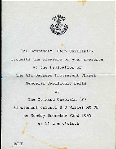 En 1957, la congrégation de la All Sappers’ Chapel, en collaboration avec les membres actifs ou anciens du CRGC, a installé un carillon Coronation de marque Schulmerich dans la chapelle. Ce carillon a été dédié, le 22 décembre 1957, à la mémoire des membres du CRGC qui ont perdu la vie lors de la Première et de la Deuxième Guerre mondiale ou pendant qu’ils étaient au service de l’ONU. Pendant 27 ans, ce carillon a été entendu tous les dimanches, jusqu’à ce qu’il arrête de fonctionner en 1983/1984. Après plusieurs vaines tentatives pour réparer le carillon, il a été décidé qu’en raison des coûts de main-d’œuvre élevés, il n’était pas viable à ce moment-là de réparer le système. En 1987, le comité de la chapelle a rencontré des représentants de Schulmerich Carillons Inc et de Maas-Rowe Carillons Inc. Le 19 janvier 1988, lors de la réunion régulière du All Sappers’ Chapel Committee, la décision a été prise de remplacer le système original par le système de Maas-Rowe Carillon de l’heure. Une cérémonie de reconnaissance a eu lieu en 1957. À cette époque, une plaque a été placée dans la chapelle à la mémoire des ingénieurs décédés. Il y a aussi eu une cérémonie de reconnaissance quand le carillon de Maas-Rowe a été installé et une plaque adjacente à l’originale, sur laquelle est inscrite la date de la nouvelle inauguration, a été ajoutée. Quand la chapelle de la BFC Chilliwack a fermé, le système de carillon à la mémoire du CRGC a été transféré à la St Luke’s Chapel de la BFC Gagetown. Aujourd’hui, le carillon est à l’atelier de réparation à Moncton. La St Luke’s Chapel étudie la possibilité de le perfectionner.