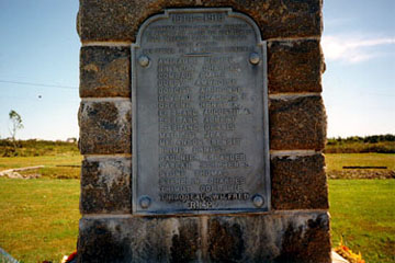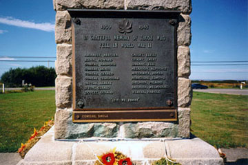 [On remarquera qu'une plaque a été rajoutée en bas de la plaque originale pour y ajouter le nom d'Émile Comeau. En 1996, les paroisses de Clare voulaient connaître leurs combattants tués aux guerres. À la suite de cette demande, Gérard Thériault, légionnaire, a découvert qu'il y a eu deux Émile Comeau de la région qui avaient sacrifié leur vie dans les guerres mondiales (l'un pendant la première guerre, l'autre pendant la deuxième) et que le nom du deuxième ne paraissait pas sur la plaque. Ainsi, en 1997, on a ajouté le nom de Émile Comeau au bas de la plaque lors d'une cérémonie spéciale de reconnaissance. La photo ci-dessous montre Madame Nora Blanchette, la soeur d'Emile Comeau, posée devant le monument à l'occasion de cette cérémonie. (Pour plus d'information, voir Le Courrier de la Nouvelle-Ecosse du vendredi 29 août 1997)./Note that a plaque was added on the bottom of the original plaque in order to add the name of Émile Comeau. In 1996, the parishes of Clare wanted to know the names of the soldiers of their region who had been killed in the wars. Given this request, a legionnaire, Gérard Thériault, discovered that two men from the region named Émile Comeau had sacrificed their lives in the world wars (one during the first war, and the other during the second) and that the name of the second did not appear on the plaque. It was thus that, in 1997, on the occasion of a special remembrance ceremony, the name of Émile Comeau was inscribed on another plaque added at the bottom of the monument.