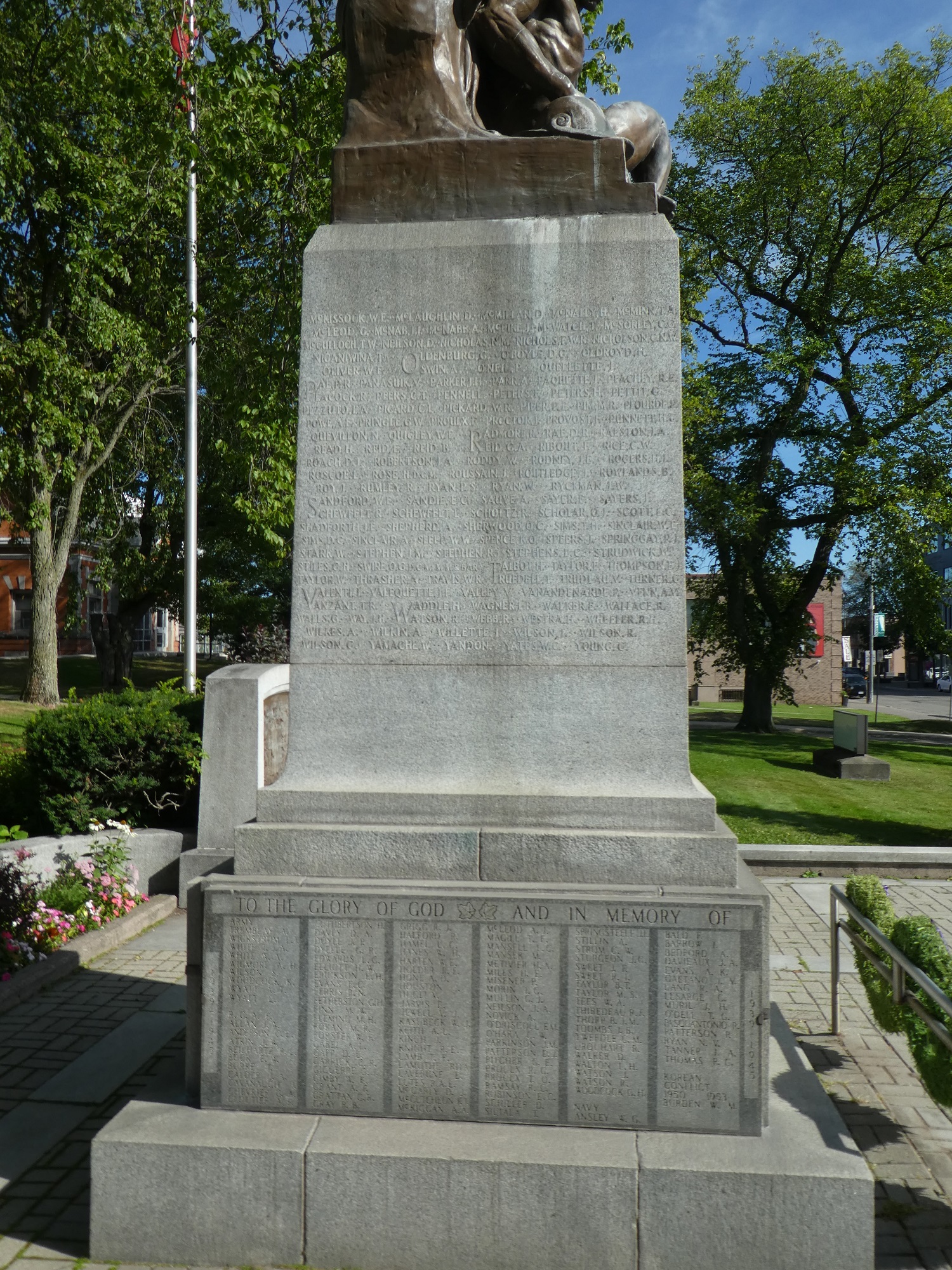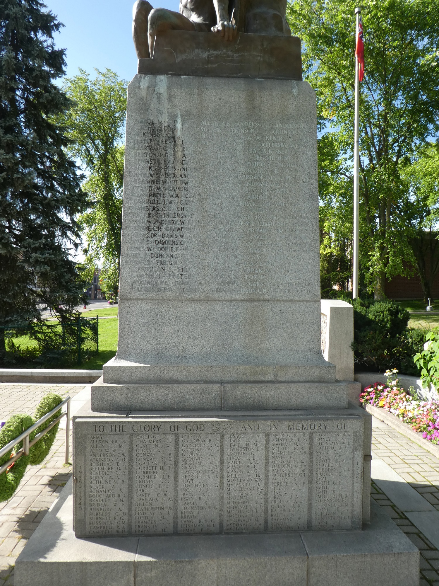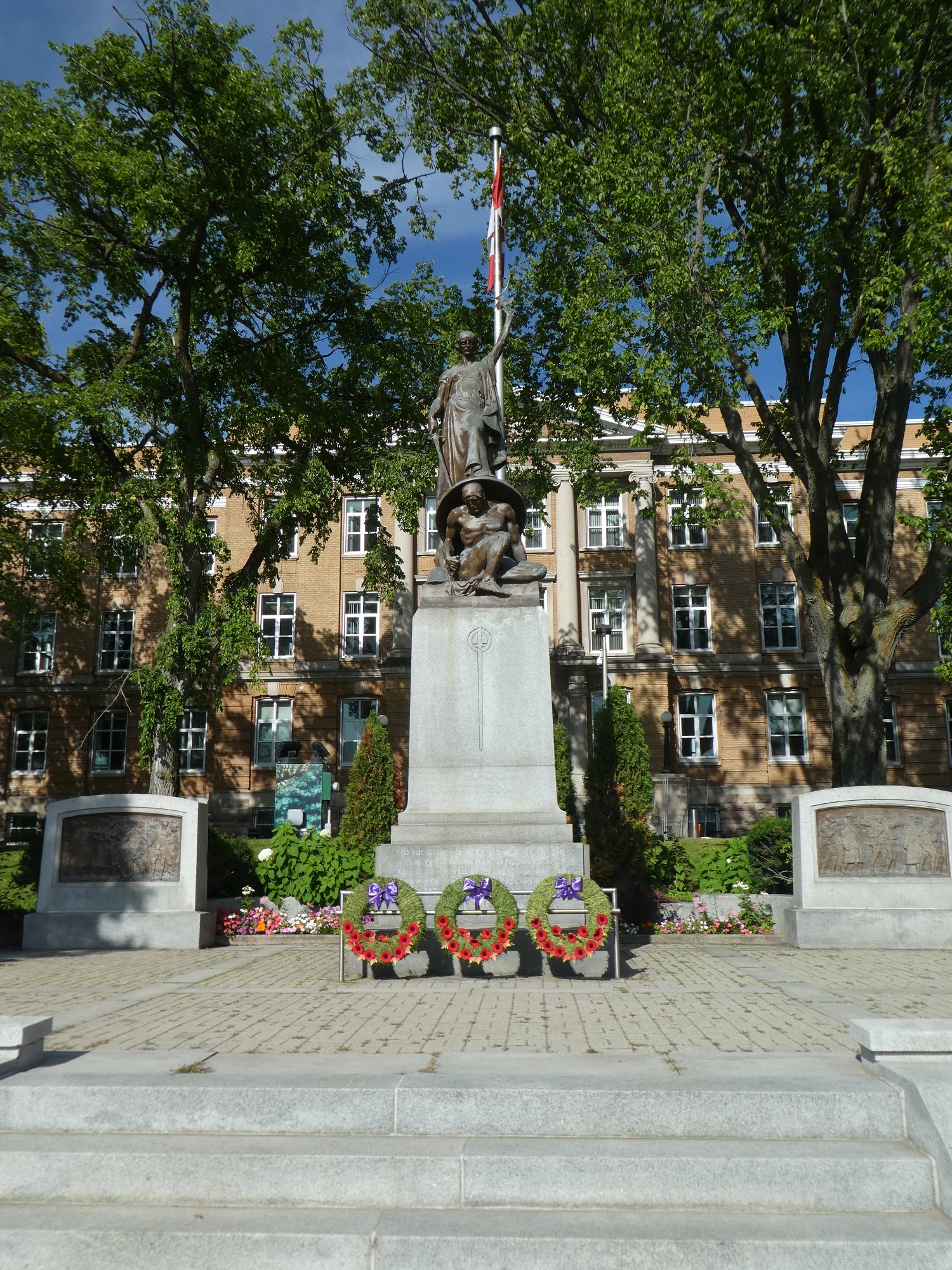 La collecte a été un succès et un projet de sculpture soumis par le Torontois Alfred Howell, sur le thème du « Triomphe du Bien sur le Dieu de la Guerre », a été retenu. La pierre d’angle, portant une prière et des symboles des morts, a été posée par Francis H. Clergue en août 1923 et bénie par le révérend Scott. J.W. Curran, fondateur et rédacteur en chef du Sault Star, a écrit au célèbre Rudyard Kipling pour lui demander d’écrire un poème qui figurerait avec une inscription sur le monument. L’écrivain a accédé à cette requête tout à fait inhabituelle.