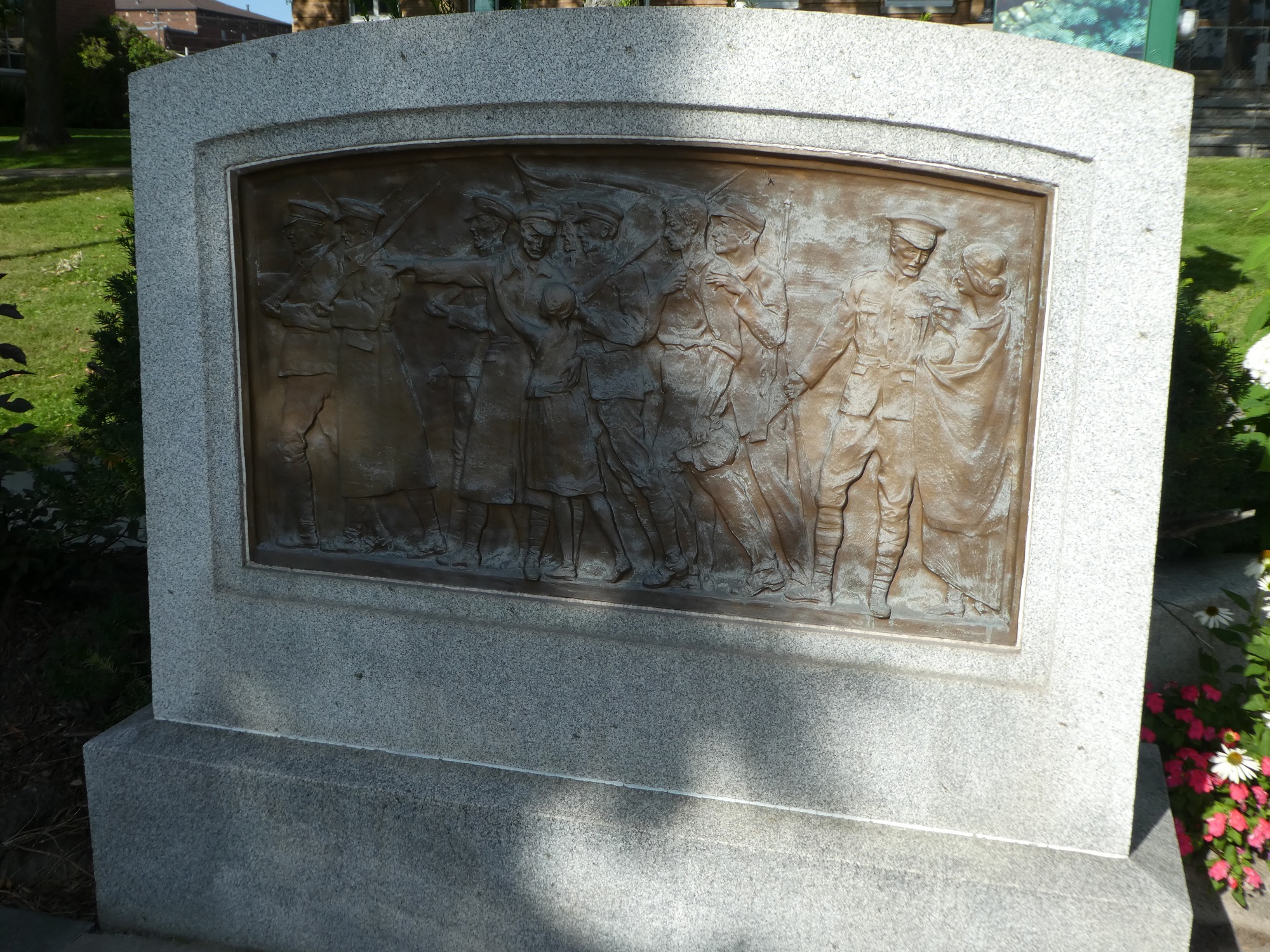 La figure ramassée sur elle-même qui s’abrite sous un bouclier représente le Dieu de la guerre. La figure drapée qui tient une épée dans sa main droite et une feuille d’érable dans sa main gauche représente le triomphe du Bien. Les panneaux latéraux représentent des hommes qui répondent à contrecœur à l’appel aux armes et des soldats qui aident les blessés.