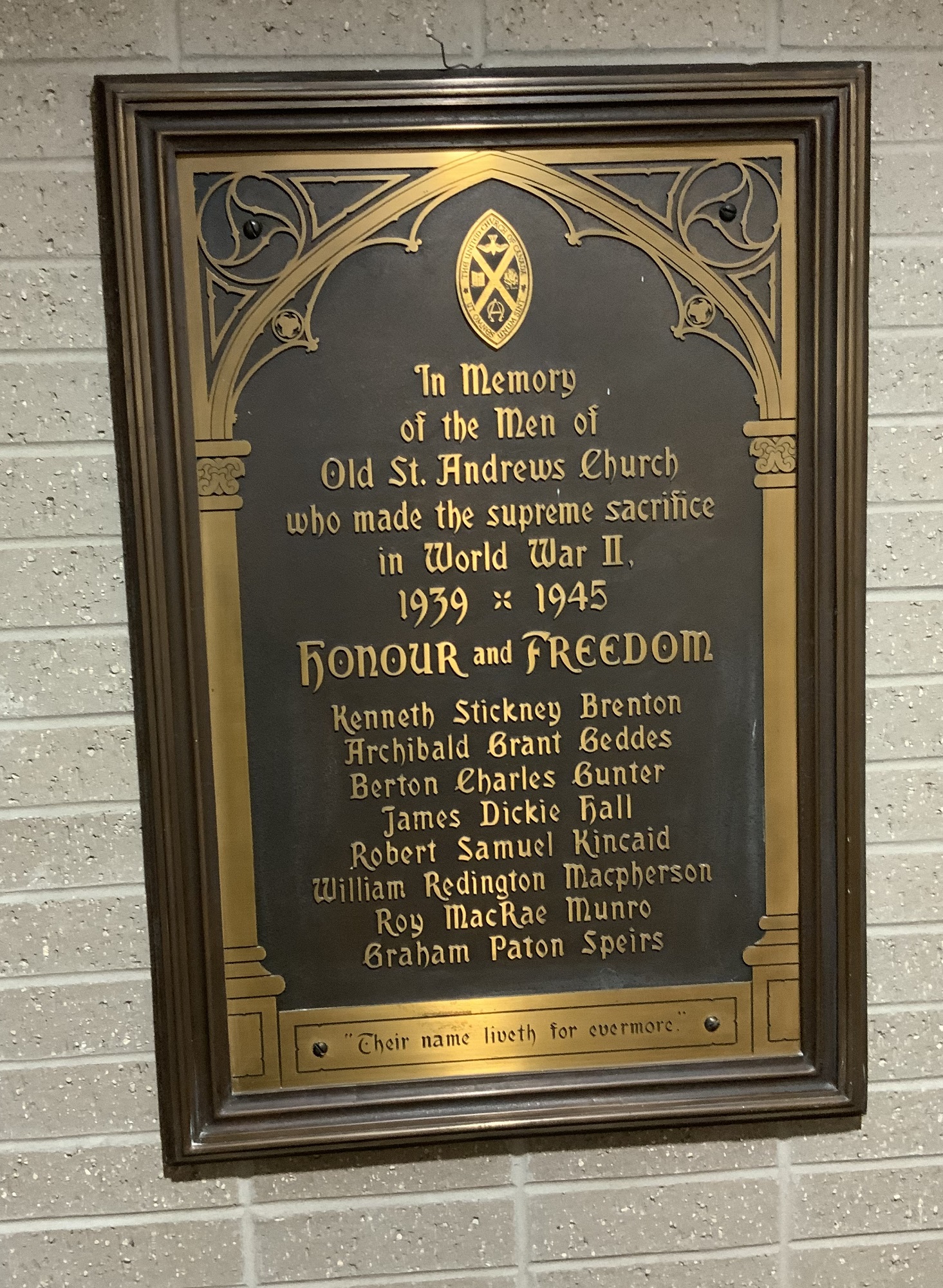 On ne sait pas quand la plaque de la Seconde Guerre mondiale a été érigée dans l’église unie Old St. Andrew’s (anciennement église presbytérienne Old St. Andrew’s, fondée en 1876). En 1950, l’Église unie Old St. Andrew’s et l’Église unie Westminster?Central ont fusionné pour former l’Église Unie St. Andrew’s à l’emplacement actuel de la rue Bloor.