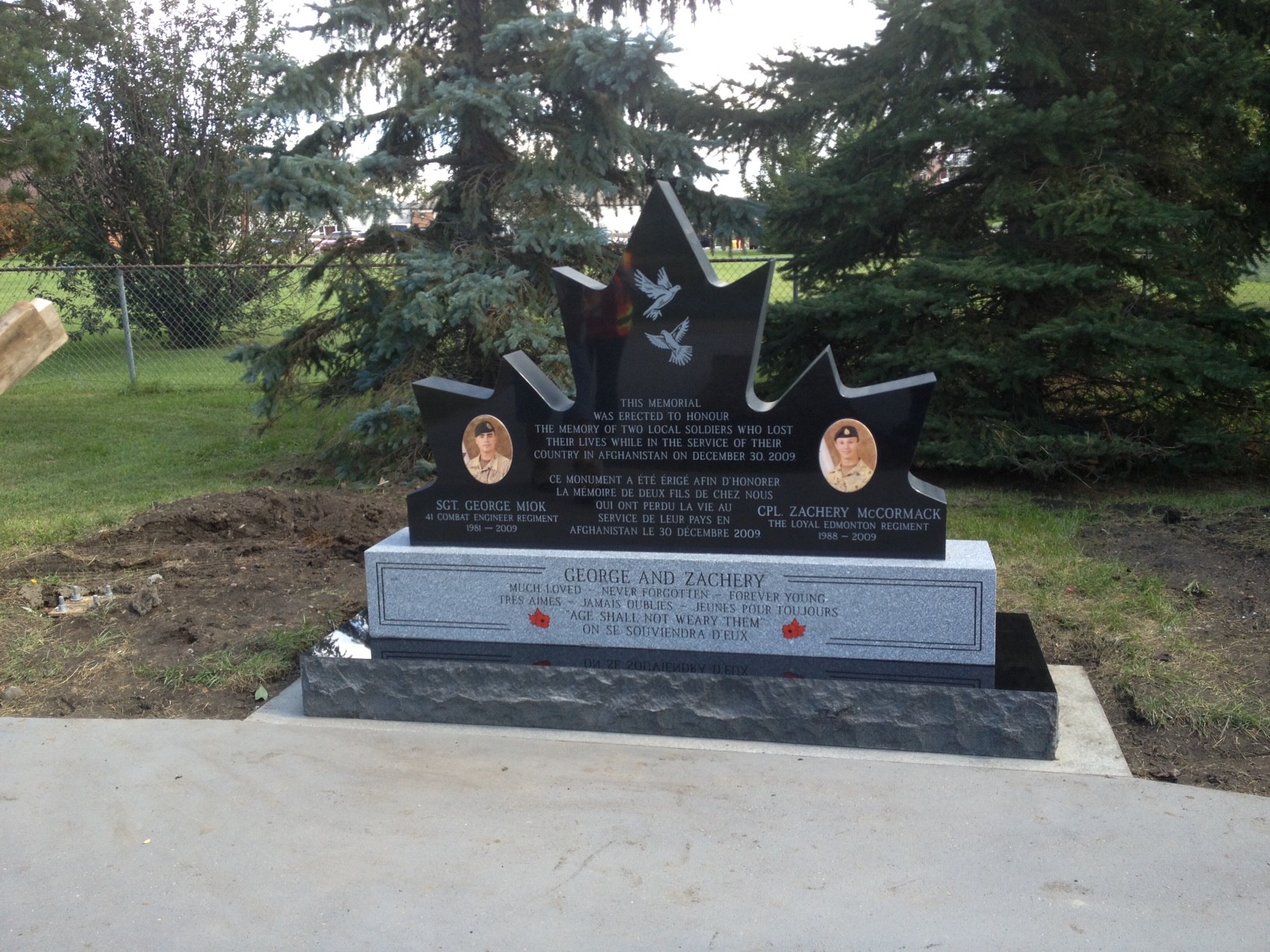 Ce monument, une feuille d’érable en granit noir posée sur un socle de béton, est dédié au sergent George Miok et au caporal Zachery McCormack. Bill Morris, qui connaissait personnellement Georg Miok car ses enfants étaient allés à l’école avec lui, a déclaré que l’idée d’un monument commémoratif avait été présentée pour la première fois au conseil municipal en 2010, quelques mois après la mort des soldats. Bill était à la tête d’un groupe local qui souhaitait rendre hommage aux deux soldats de Sherwood Park tués en Afghanistan, en érigeant un monument spécial en leur honneur. Ce dernier a été érigé le 24 août 2013 dans le cadre d’un partenariat communautaire avec le comté de Strathcona. Il a été érigé le 24 août 2013 par la municipalité de Sherwood Park, dans le comté de Strathcona.