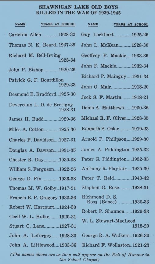 En 1953, la Shawnigan Lake School War Memorial Society et le Old Boys Committee y aménagent deux courts de tennis, nommés War Memorial Tennis Courts. En mars 1953, l’honorable Clarence Wallace, C.B.E., lieutenant-gouverneur de la Colombie-Britannique, remet à l’école un tableau d’honneur portant les noms des 42 anciens étudiants de Shawnigan qui ont péri lors de la guerre de 1939-1945. Ce tableau d’honneur est en exposition permanente dans la chapelle.