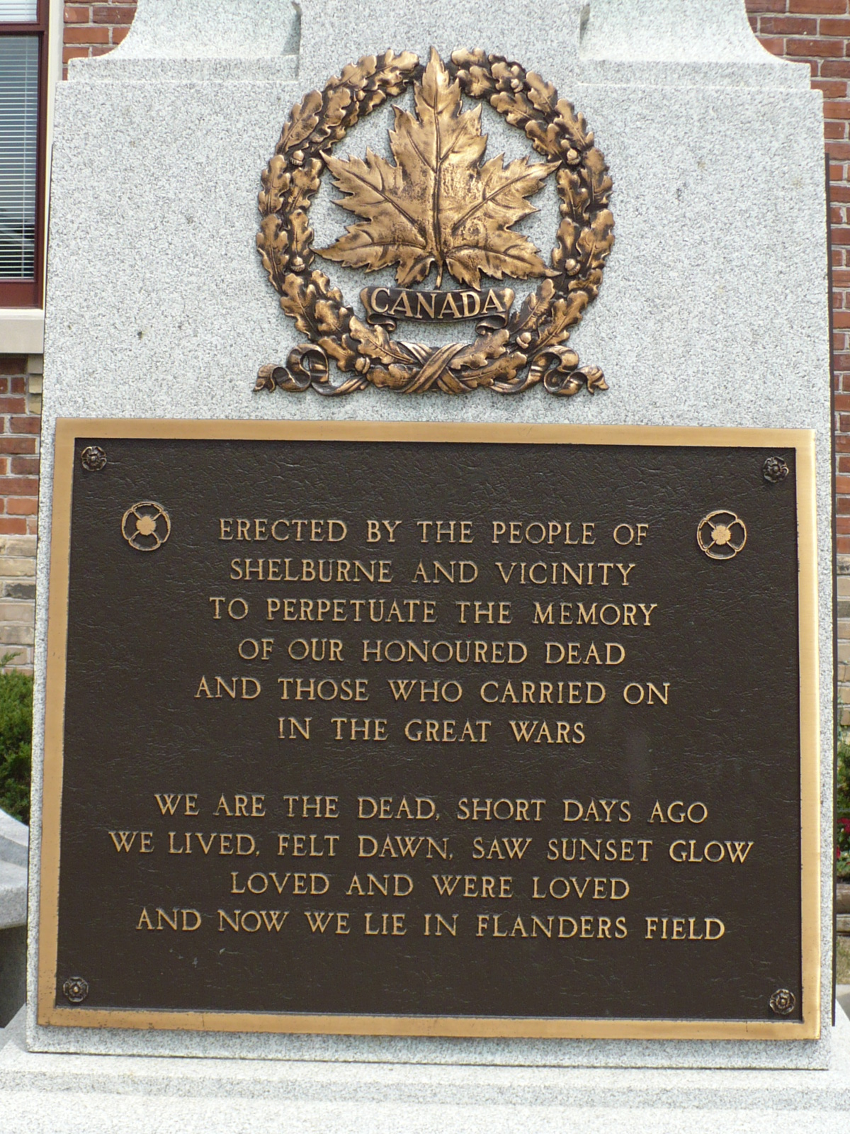 Au début 1919, la Great War Veterans Association of Canada et la Légion royale canadienne ont proposé l’érection d’un monument commémoratif en hommage aux personnes de la région qui ont perdu la vie pendant la Première Guerre mondiale. Deux ans et demi plus tard, la proposition a capté l’attention des responsables municipaux et du conseil du comté de Dufferin, et de l’argent a été amassé pour trois collectivités urbaines du comté. Shelburne était l’une des collectivités qui a reçu 3 300 $ pour la construction d’un monument commémoratif.