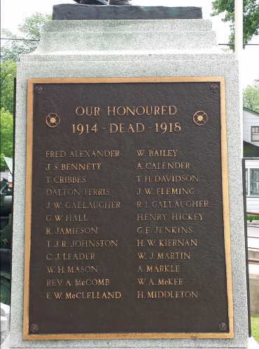 L’inauguration officielle a eu lieu le 4 juin 1923. Madame E. J. McComb de Melancthon, mère du révérend T. Allan McComb, qui est décédé outre-mer, a dévoilé le cénotaphe.