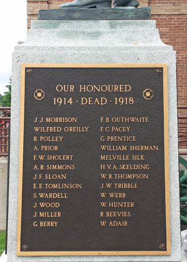 Le canon de campagne de guerre allemand capturé, au coin nord-ouest de l’emplacement, est un des trois canons reçus d’Ottawa par le comté de Dufferin. La fontaine s’est effondrée et a été enlevée à la fin des années 1950.