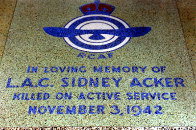 "RCAF IN LOVING MEMORY OF L.A.C. SIDNEY ACKER KILLED ON ACTIVE SERVICE NOVEMBER 3, 1942."
