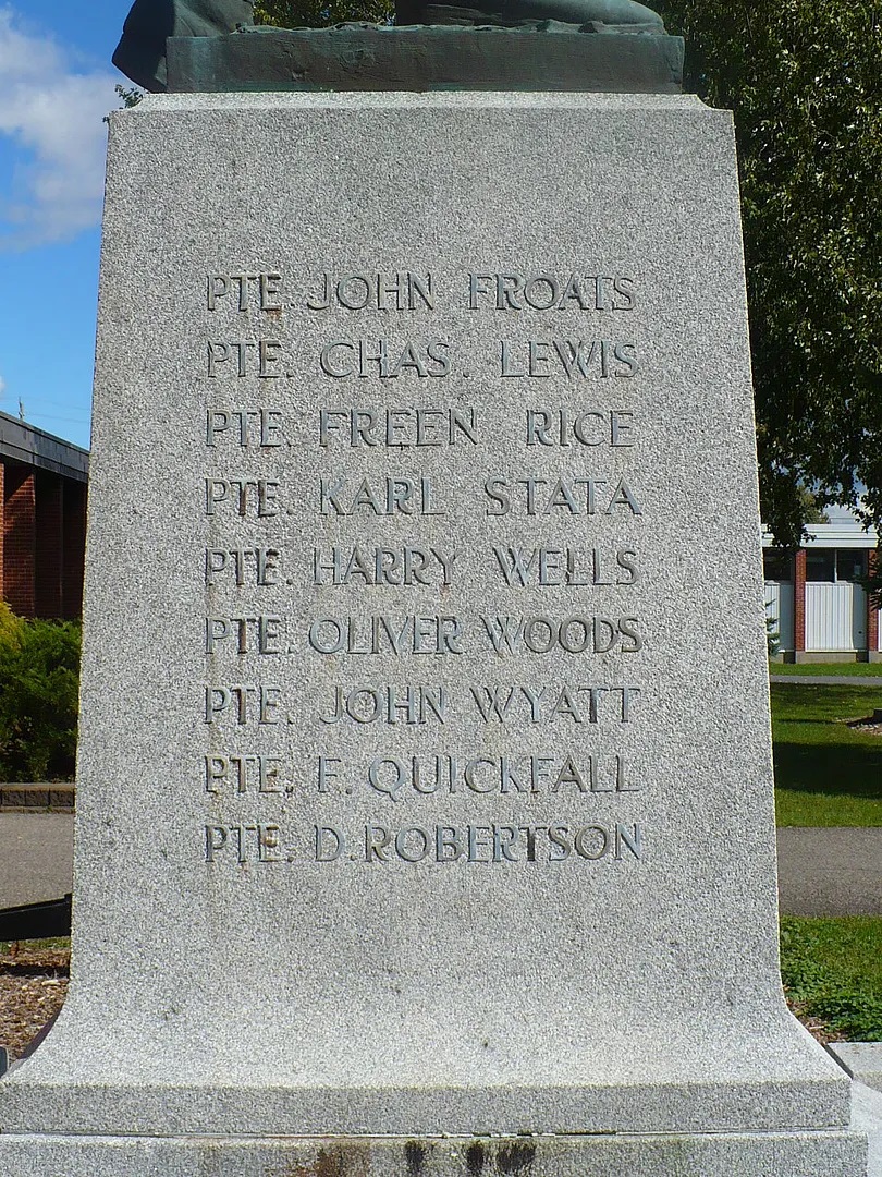 Plus de 5 000 personnes ont assisté, le 9 septembre 1923, à l’inauguration du monument aux morts érigé dans le parc municipal, à l’angle sud-est de la rue Main et de la route 31. Une rangée de majestueux peupliers de Lombardie, plantés par M. John H. Meikle, formaient un arrière-plan coloré pour la statue de bronze. Le mémorial a été déménagé par la suite devant l’édifice municipal de Morrisburg, rue Fifth.