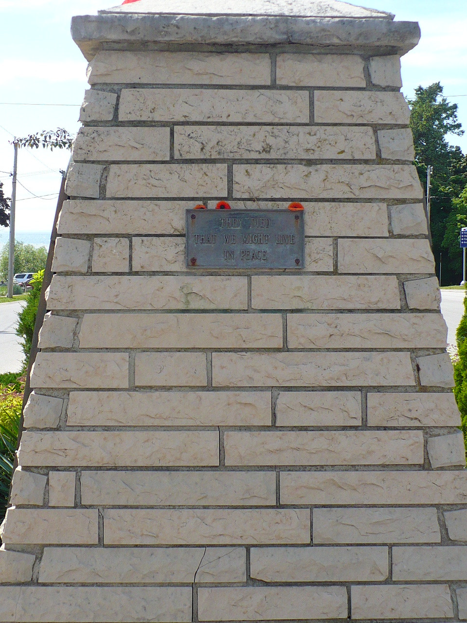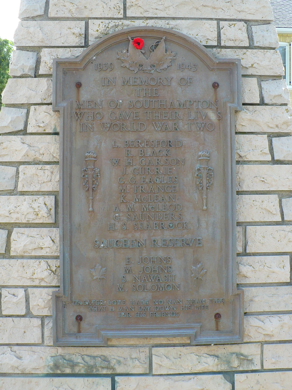 Le cénotaphe est constitué de deux plaques de bronze, une pour chacune des guerres mondiales, portant les noms des hommes de Southampton et de la Première Nation de Saugeen voisine qui ont donné leur vie. Les plaques de bronze ont été produites à North Bay chez Rhan Metals, une entreprise aujourd’hui devenue Rhan Plastics. La plaque de la Première Guerre mondiale se trouvait auparavant dans la tour de l’hôtel de ville, où elle avait été inaugurée avec l’horloge commémorative en 1922. Une grande croix a été ajoutée plus tard derrière le cénotaphe.