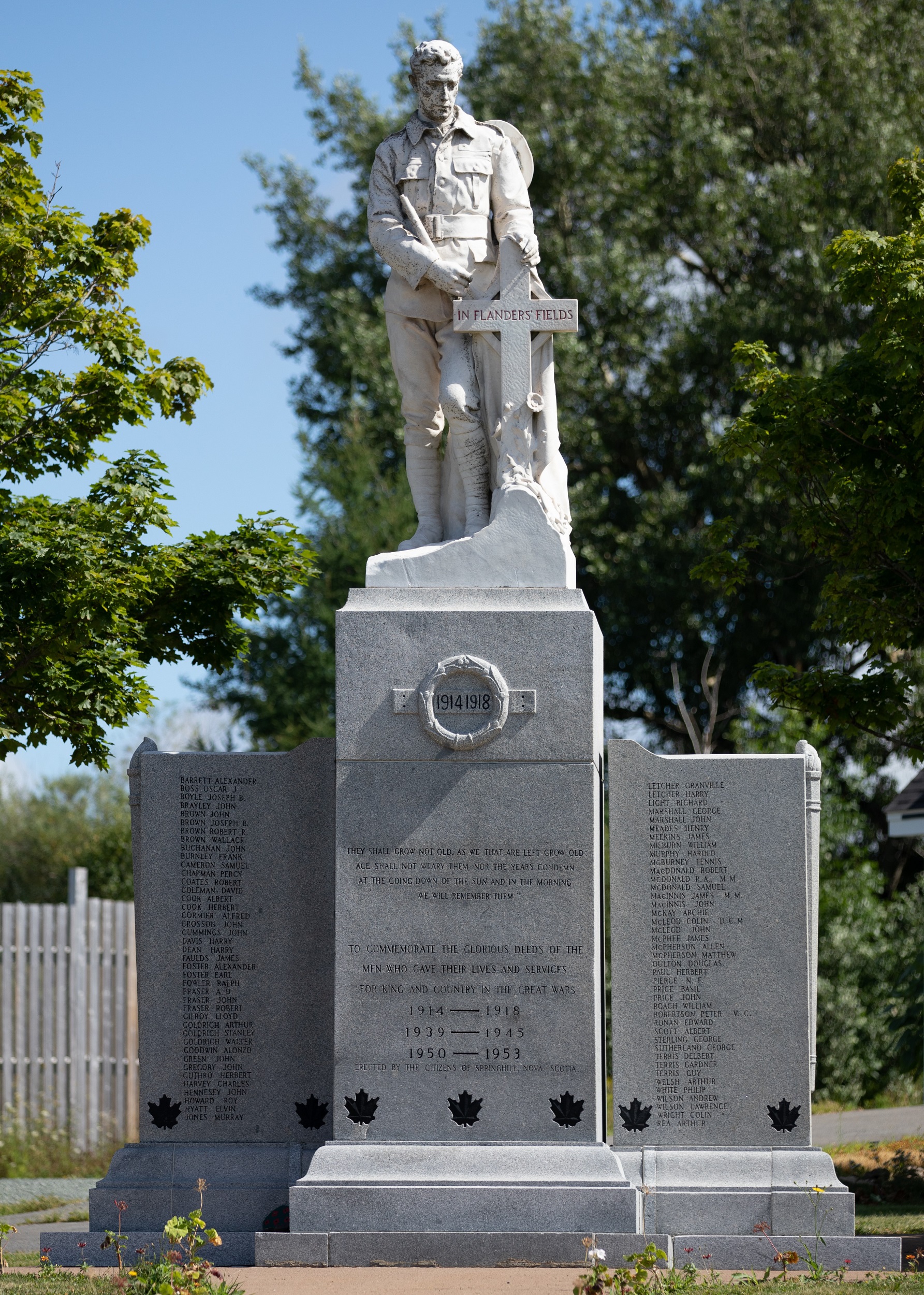Èrigé par les citoyens de Springhill après la Première Guerre mondiale en hommage à leurs morts, ce magnifique monument militaire a été inauguré officiellement le 4 août 1929. C’est Mme Annie Goldrich, qui a sacrifié trois fils à la cause, qui a eu l’honneur de dévoiler le mémorial. La garde a présenté les armes, et le trompette Young a exécuté la sonnerie aux morts.