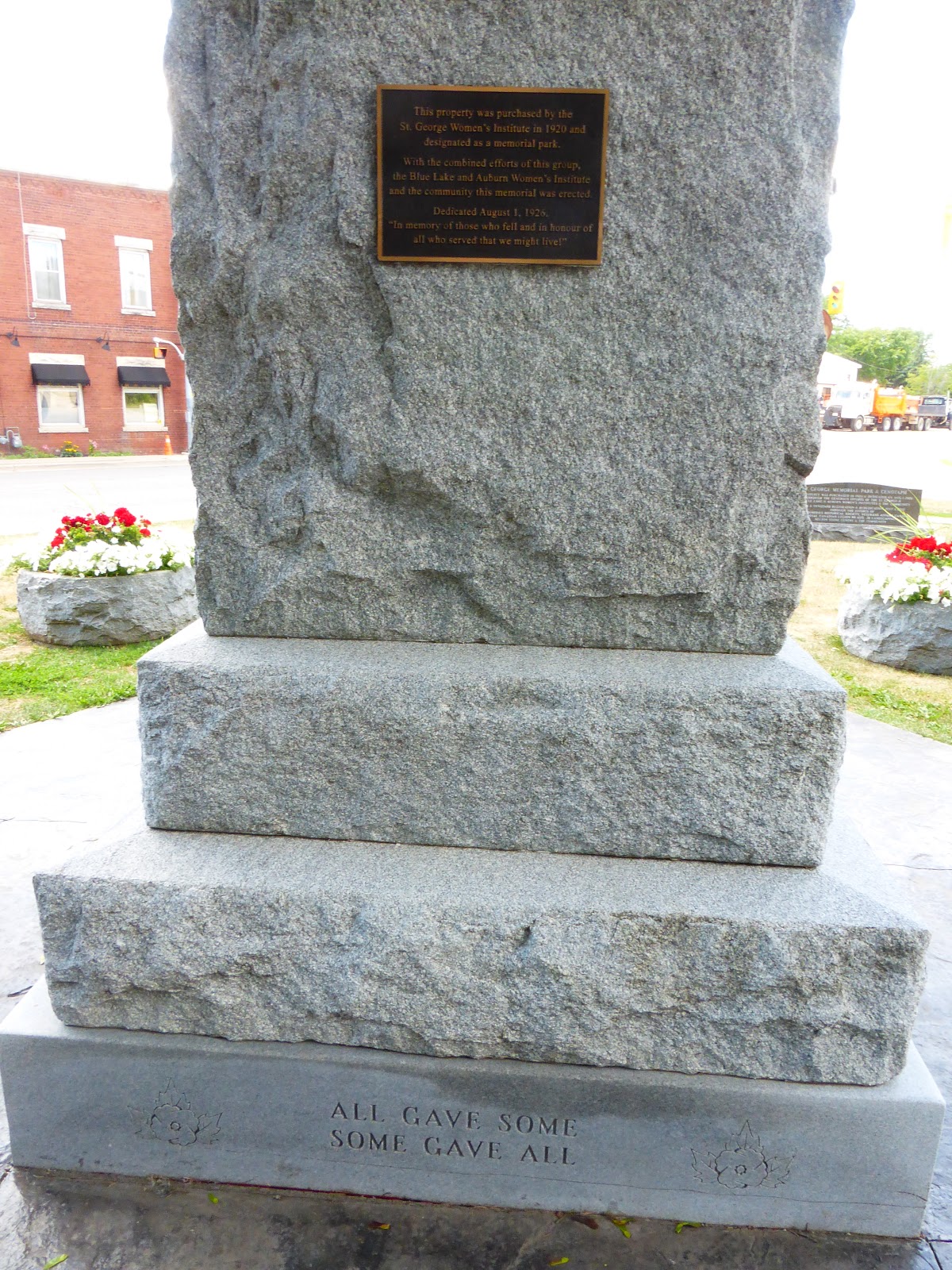 Les instituts féminins de St. George, Blue Lake et d’Auburn ont acquis le terrain en 1920 et ont par la suite commandé ce cénotaphe qui devait être érigé au parc commémoratif de St. George. Dévoilé officiellement le 1er août 1926, le cénotaphe vise à rendre hommage aux citoyens de la région qui ont sacrifié leur vie au service de leur pays pendant la Première Guerre mondiale. Une plaque de bronze a plus tard été placée sur le monument pour y ajouter les noms de ceux qui ont consenti le sacrifice ultime durant la Seconde Guerre mondiale, puis une seconde plaque a été ajoutée après la guerre de Corée à la mémoire de ceux et celles qui sont tombés au champ d’honneur.