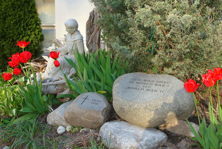 Rocaille (« Jardin de tulipes ») : Mots inscrits (en anglais) sur de petites roches : (croix) « Priez / pour / les nôtres tombés / au cours de la Première Guerre mondiale / et de la / Seconde Guerre mondiale. » Le père O’Brien a commencé à créer un jardin de tulipes spécial dans la cour du collège pour souligner le 50e anniversaire (1995) de la fin de la Seconde Guerre mondiale. Cela faisait partie d’un projet transcanadien appelé « Le Canada se souvient ». Le jardin comprend une petite statue de