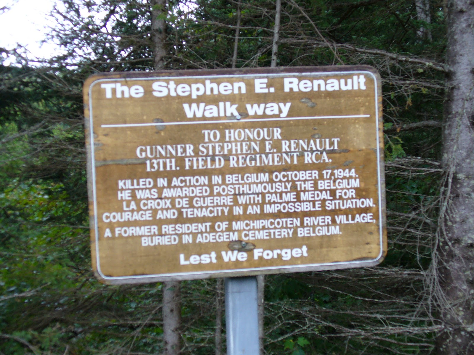 Cette allée et ce pont magnifiques, indiqués par un panneau en bois, ont été aménagés par la collectivité de Michipicoten en l’honneur de l’artilleur Stephen E. Renault, du 13e Régiment de campagne de l’ARC, qui a été tué au combat en Belgique le 17 octobre 1944. Le sentier donne sur les chutes Mission High Falls.