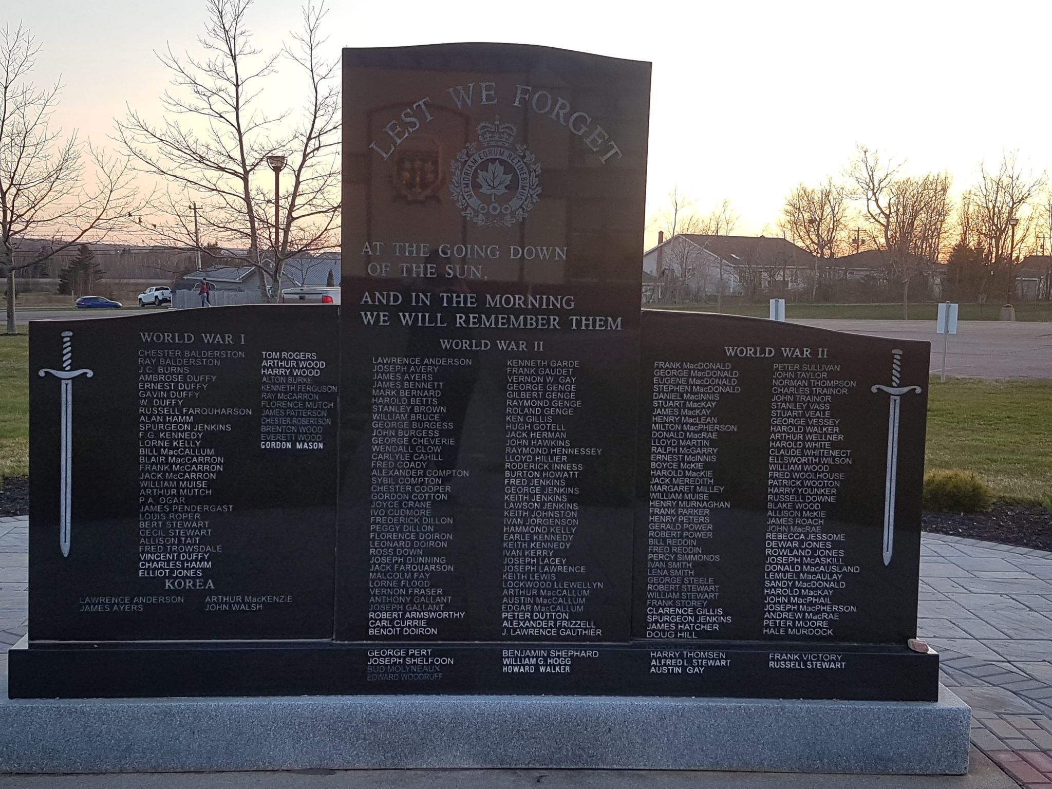 Fait de granit noir extrait en Nouvelle-Écosse, le cénotaphe a été dévoilé le 11 novembre 2006 et dédié à tous les vétérans de Stratford. Des soldats symbolisant les trois services des Forces armées (Force aérienne, Marine et Armée de terre) sont représentés au verso du cénotaphe. Un flambeau de la victoire symbolise les efforts de l’OTAN pour remporter la victoire, tandis qu’une ferme accompagnée d’un bateau de pêche symbolise ce qui a été laissé derrière lorsque les Prince-Édouardiens sont partis à la guerre.