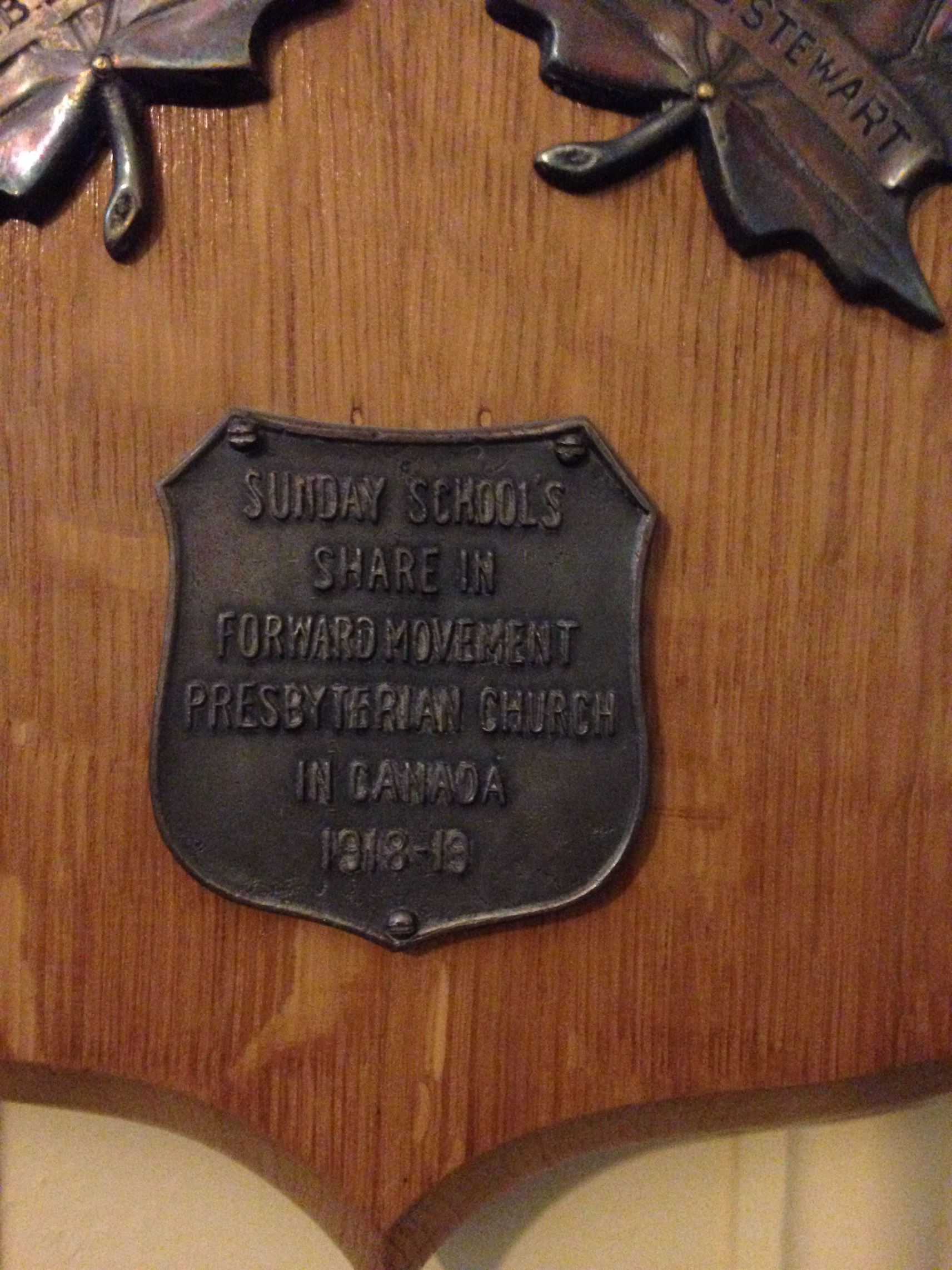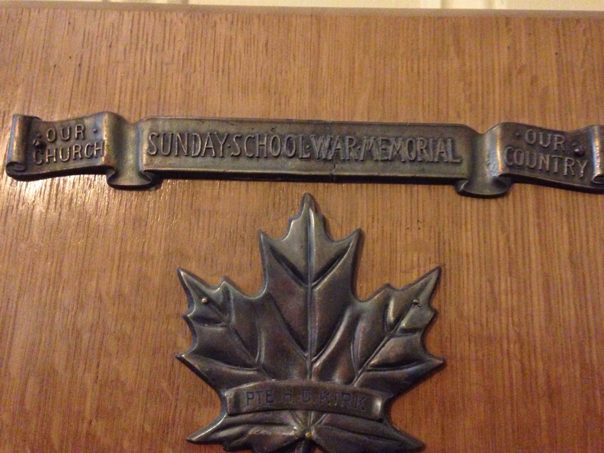 Plaque de métal sur bois énumérant les noms des trois membres de l’école du dimanche qui se sont portés volontaires pendant la Première Guerre mondiale.