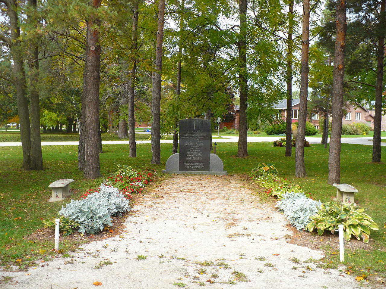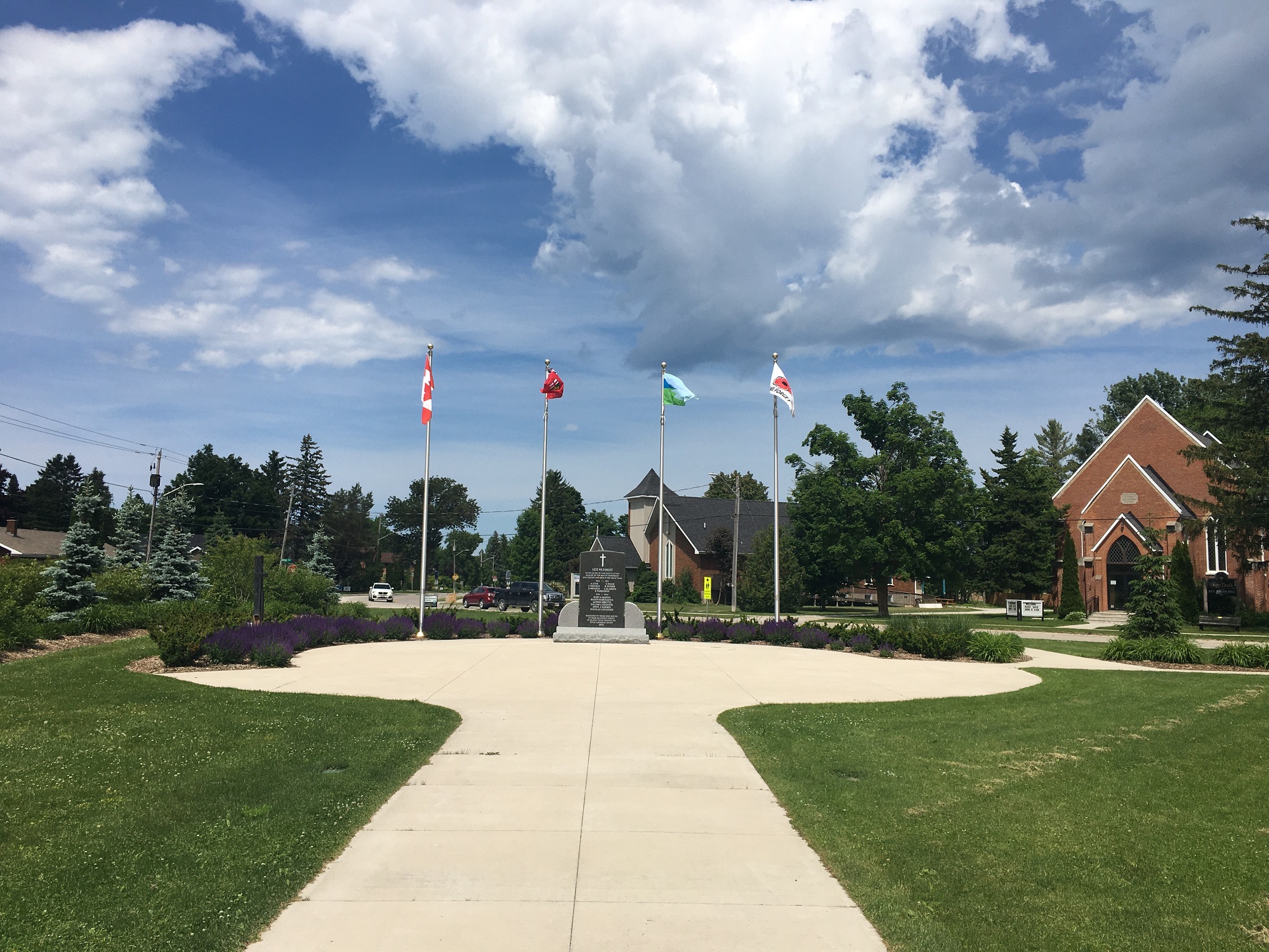 The Thornbury Cenotaph was erected in 1975 at Jack Acres Memorial Park on Russell Street, by the Royal Canadian Legion Beaver Valley Branch 281 to honour those from the area who died in the two World Wars. On 1 November 2019, it was relocated to its current location and re-dedicated on 7 June 2020.